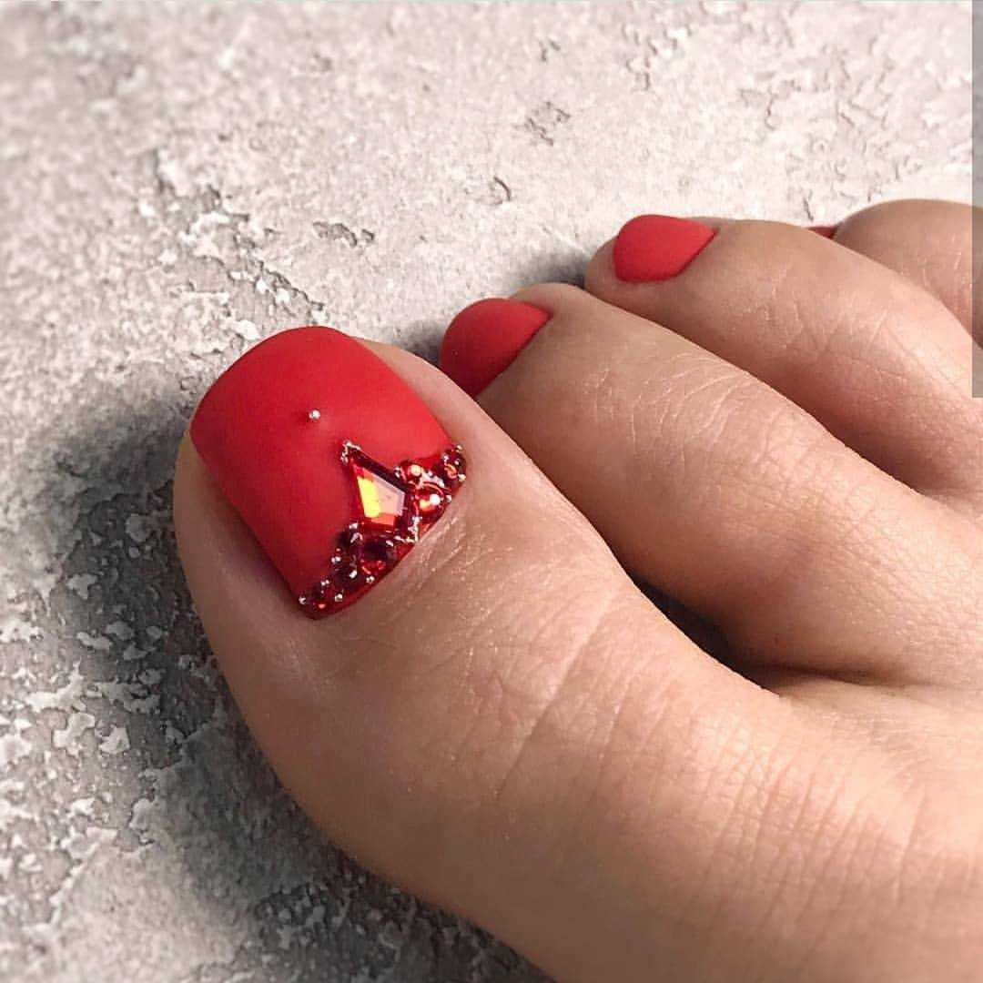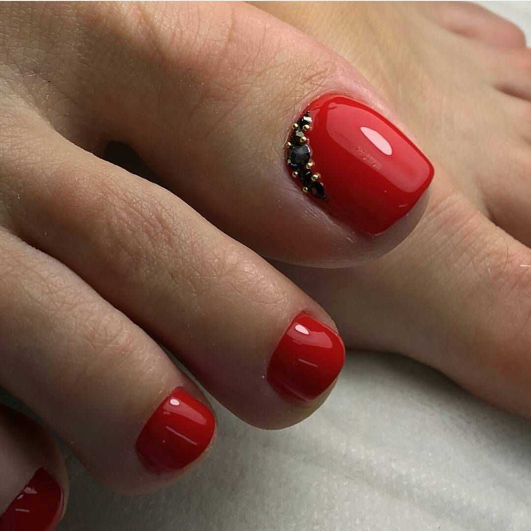 Мастера советуют женщинам немного отпускать длину ногтей на ногах, чтобы красный смог идеально ровно и гладко подчеркнуть ногтевую пластину.