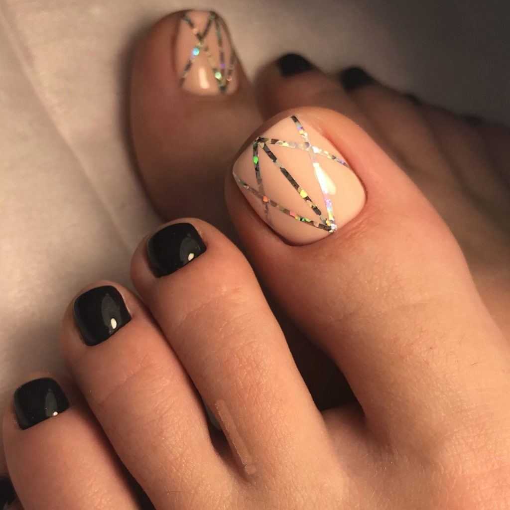 Двухцветный педикюр. Секрет в том, чтобы использовать два цвета, при этом дизайне каждого ногтя отличался от предыдущего. Допускается вкрапление глитера