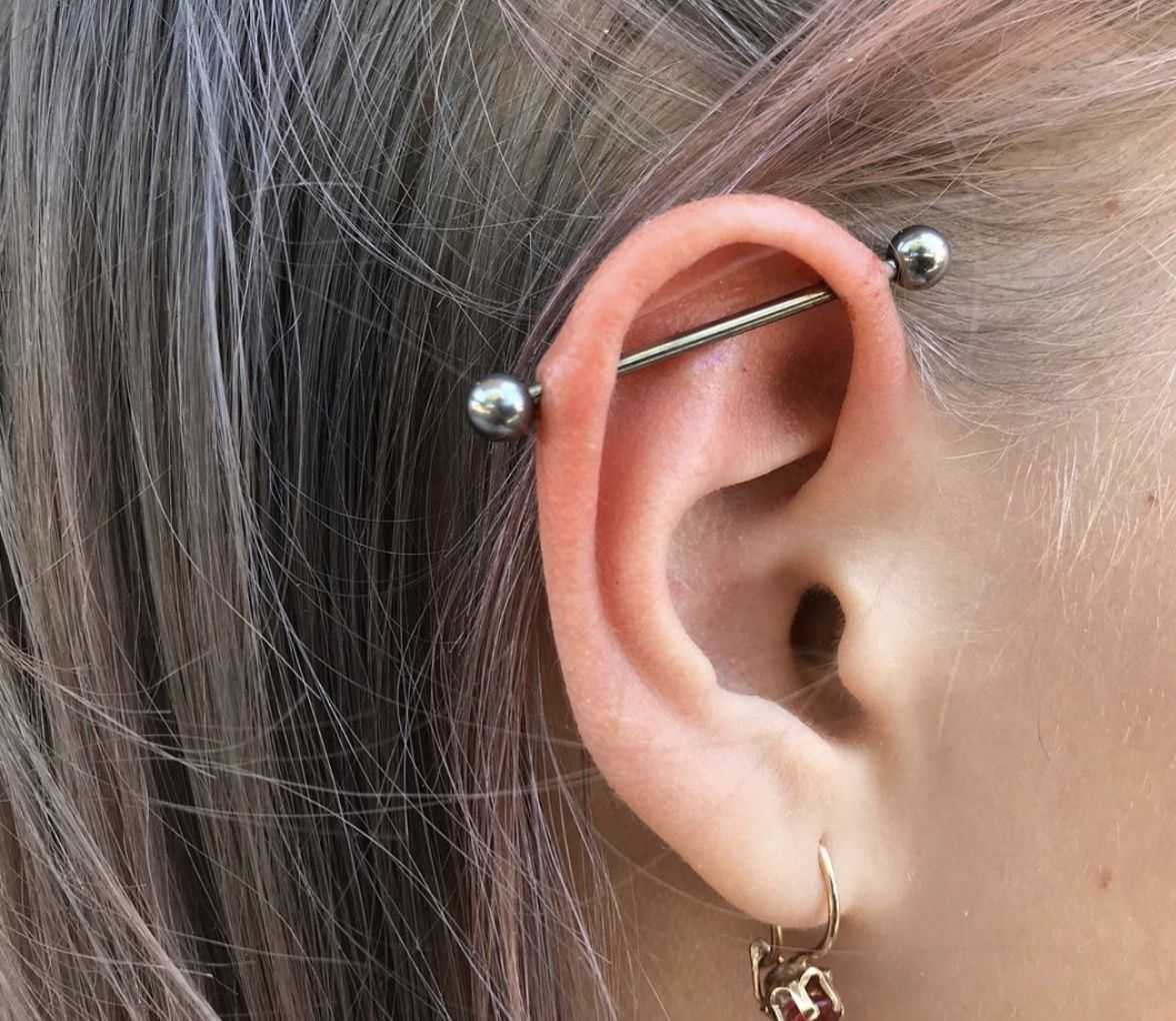 Пирсинг индастриал обычно делается в верхней части ушной раковины и предполагает создание двух параллельных проколов, соединенных одним украшением.
