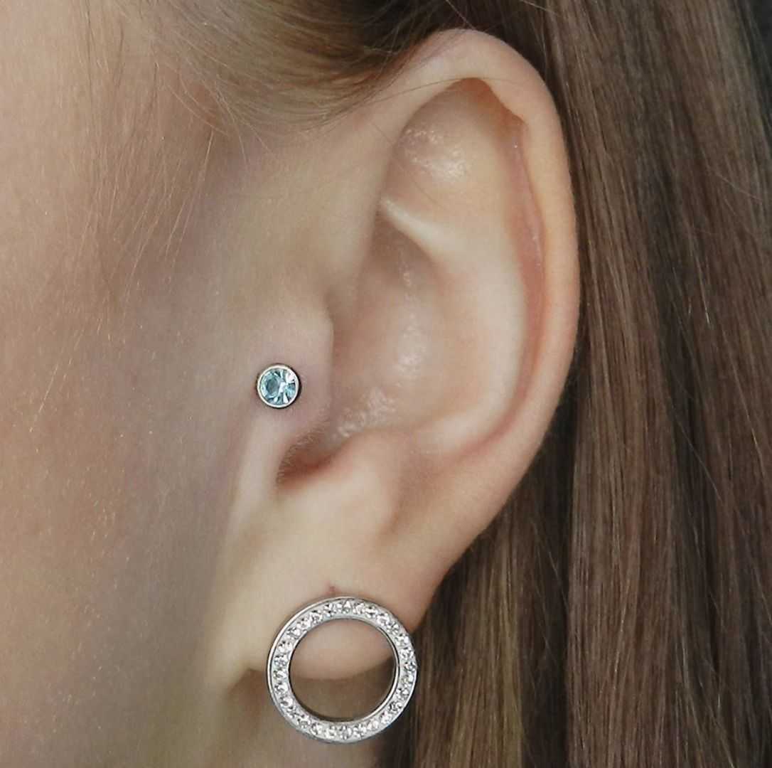 Можно проколоть не только мочку уха, но и хрящик: для этого чаще всего выбирается верхняя часть ушной раковины.