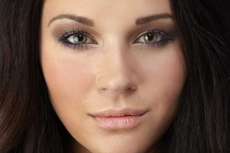 Мягкие шоколадные оттенки, тени с пурпурными и желтоватыми вкраплениями помогут превратить светло-серые очи в зеленые.