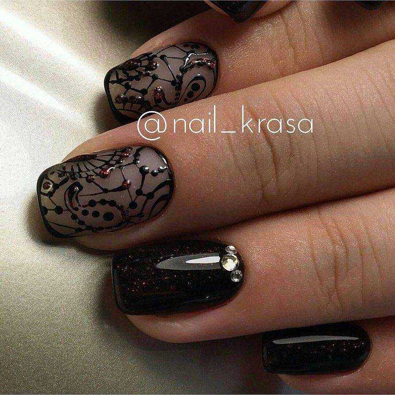 - Далее идет магия – создаем тот самый эффект вуали из подручных средств. Смешиваем на палитре черный или темный гель-лак с топом или базой (кому как нравится), соотношение 1:5. Покрываем один или два ноготка получившимся полупрозрачным составом. Для этого лучше использовать широкую плоскую кисть. На остальные ногти наносим обычный гель-лак. Сушим. Берем тонкую кисть для прорисовки мелких деталей и гель-лаком, гель-краской или гель-пастой черного оттенка наносим рисунок с виде вензелей, кружева, цветов или геометрических фигур.