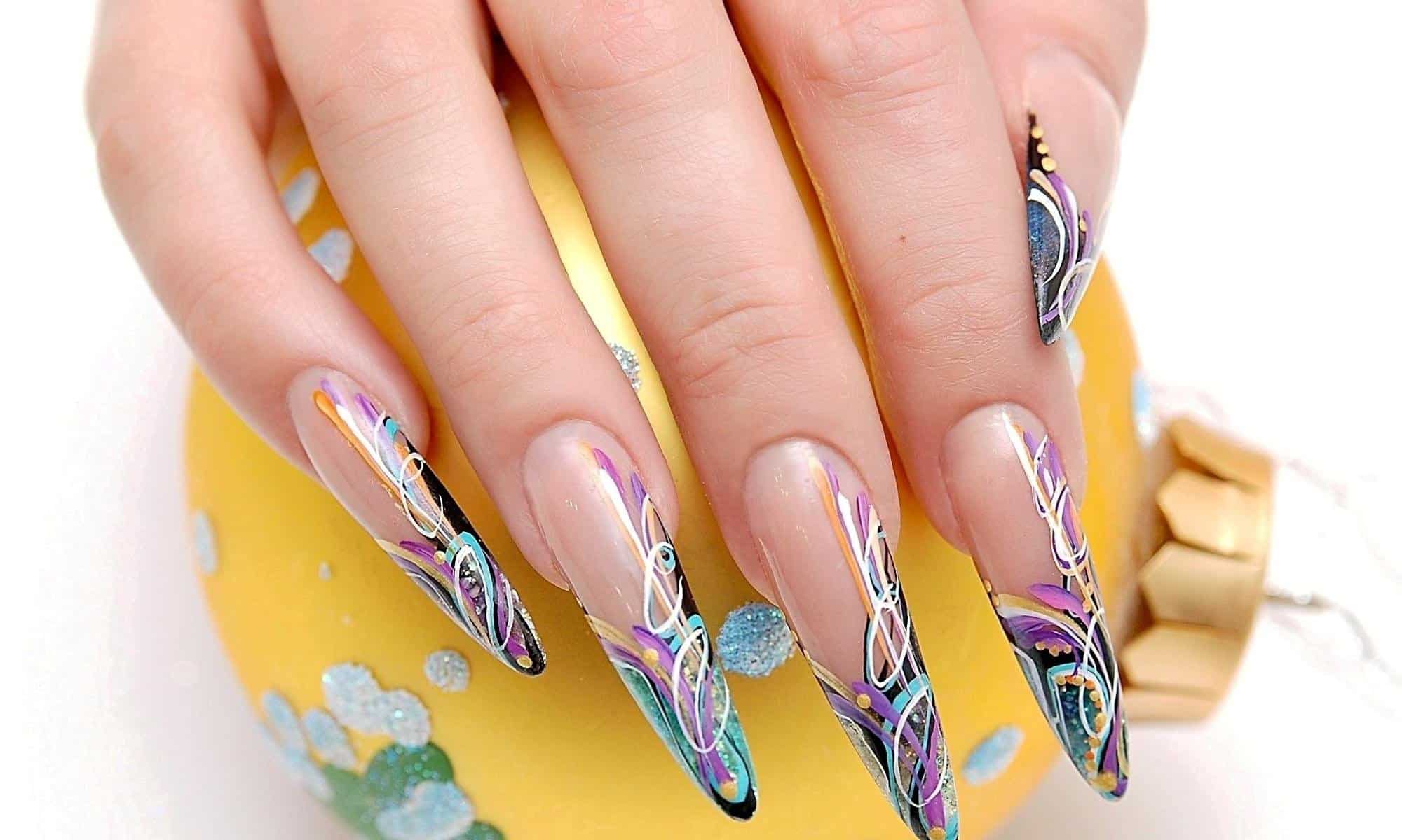 - Контурный маникюр. Здесь понадобятся витражные лаки для ногтей, которыми заполняются контуры, прорисованные на кончике ноготка контурным лаком.