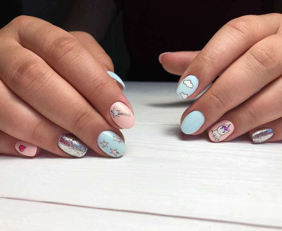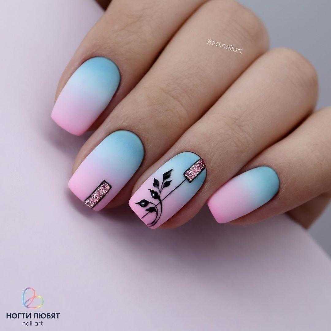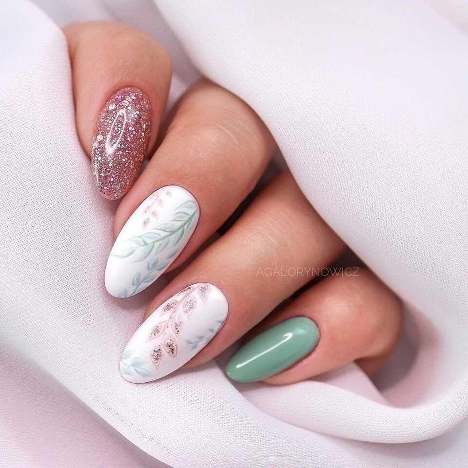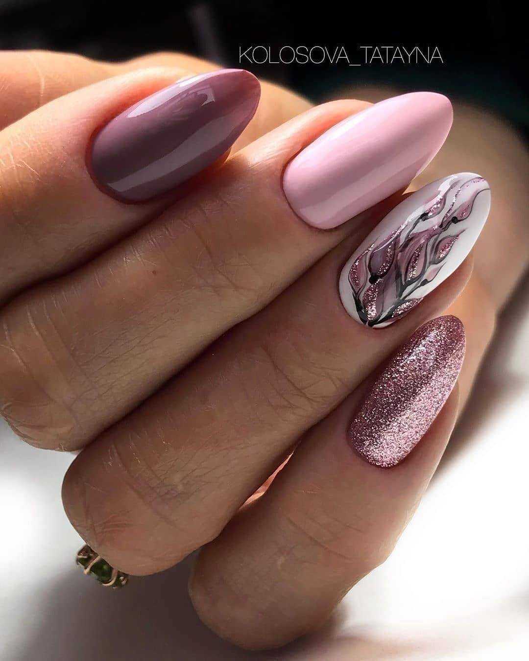 Нежные сочетания могут быть дополнены яркой вставкой в виде 3D рисунка. Гармонично выглядит маникюр с блестками, сочетая разные фактуры и техники.