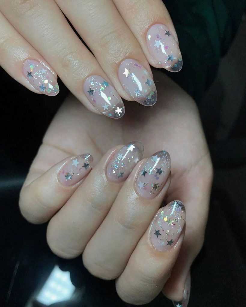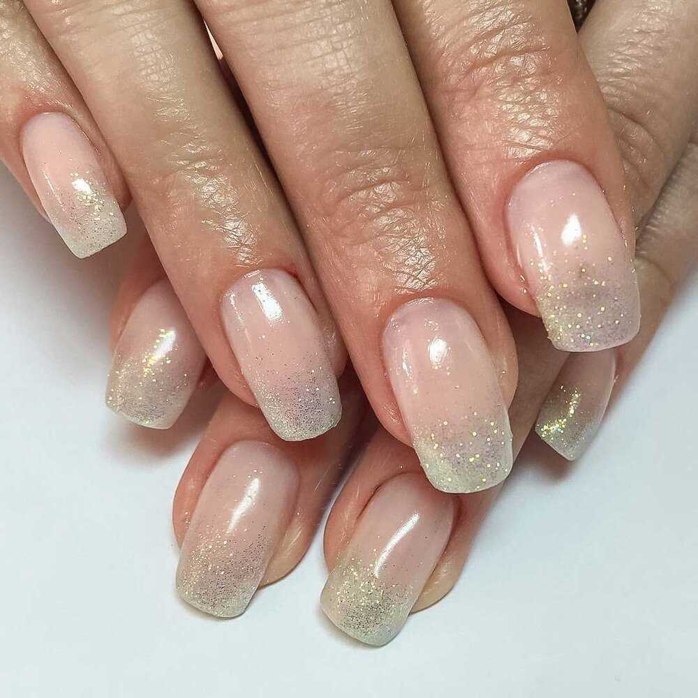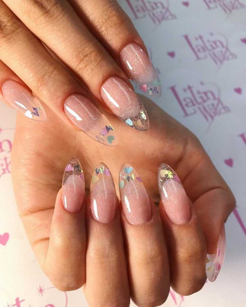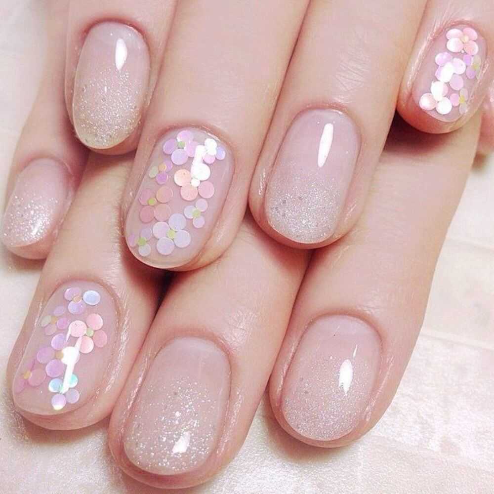 - Прозрачный маникюр с блестками подходит как для коротких, так и для длинных ногтей. Его универсальность является большим преимуществом.