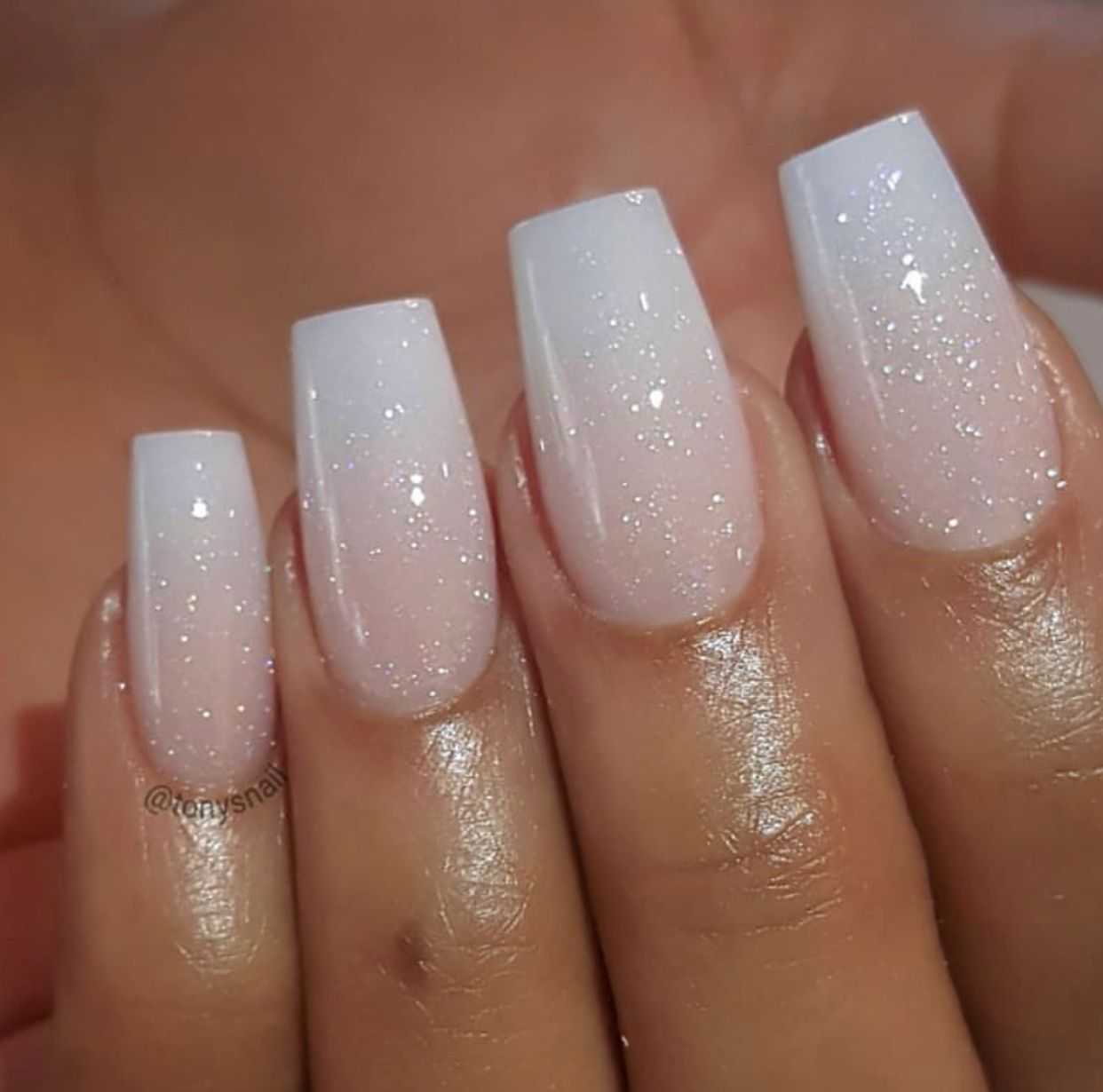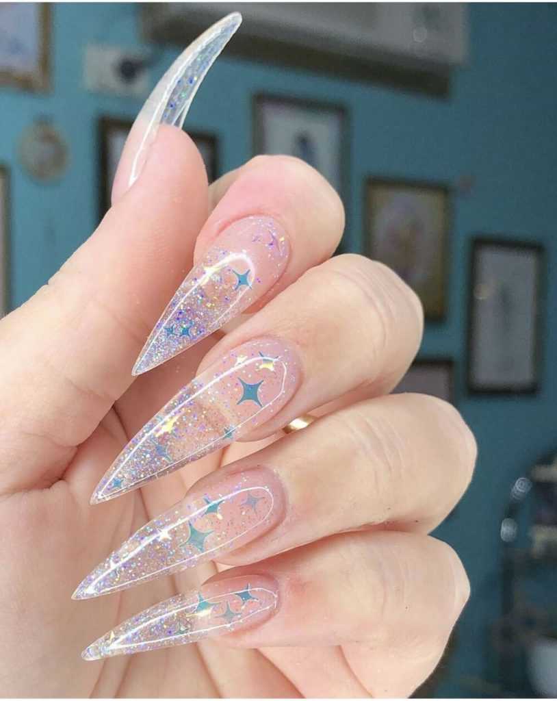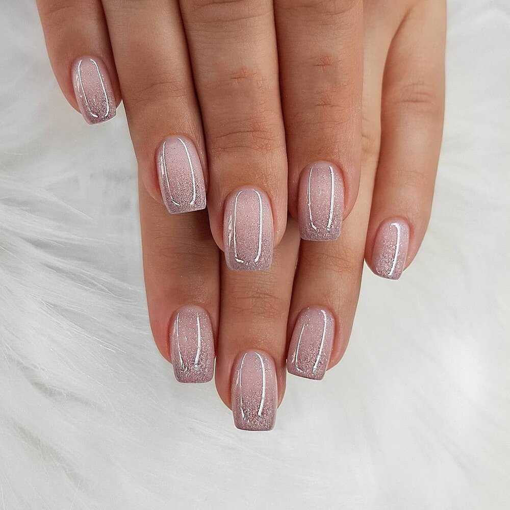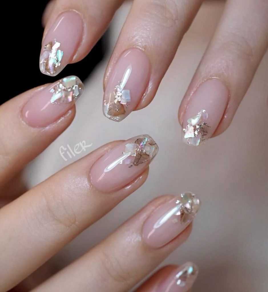 - Прозрачный маникюр с блестками подходит как для коротких, так и для длинных ногтей. Его универсальность является большим преимуществом.