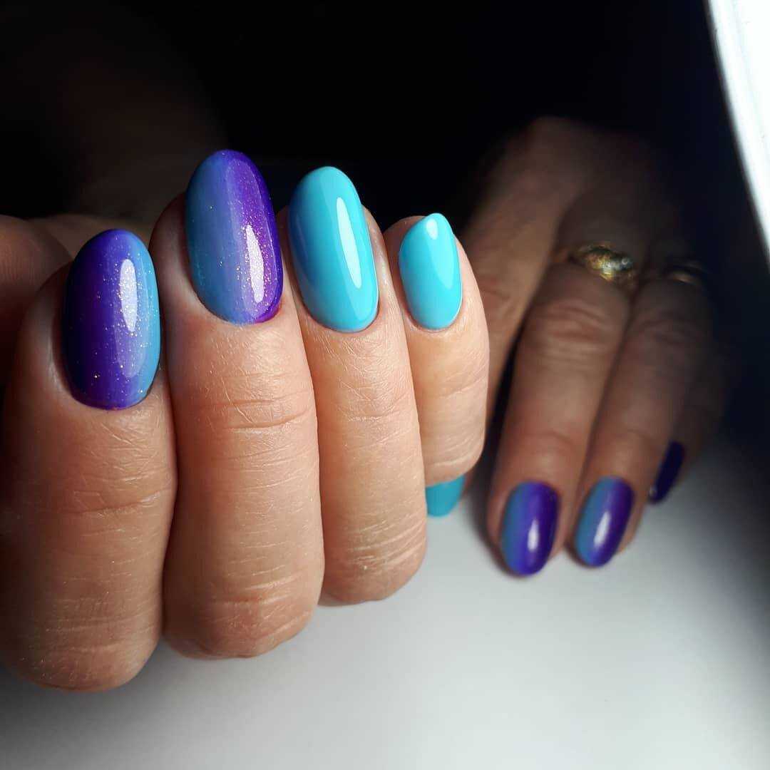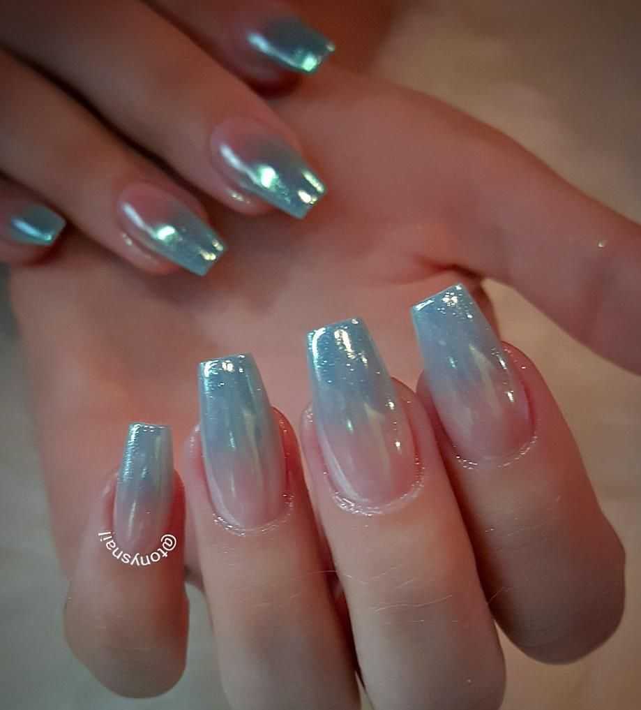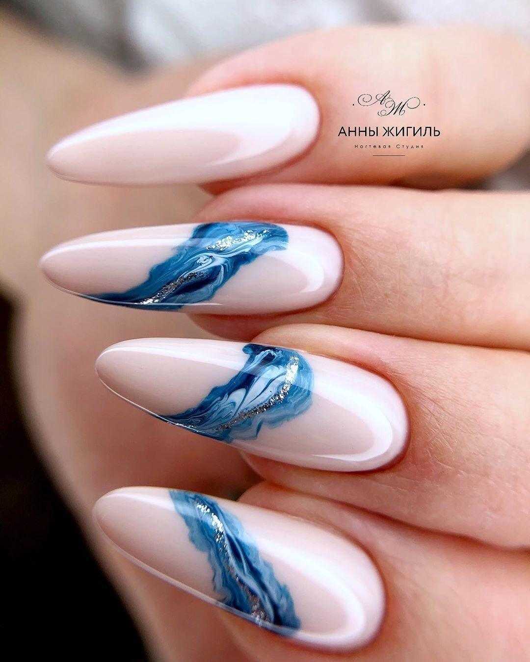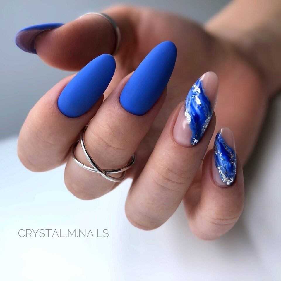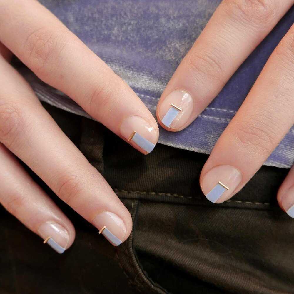 Синее море. С помощью лака синий металлик можно сотворить принципиально новые ногти негатив спейс. А понадобится вам всего-навсего скотч, ножницы и синий металлик. Оттенки синего цвета можно использовать любые. От небесной лазури до насыщенного темно-синего.