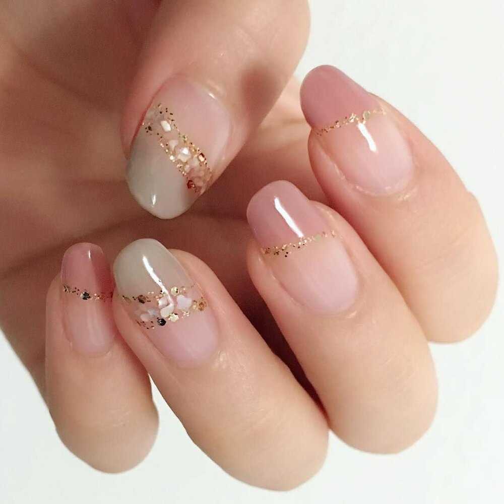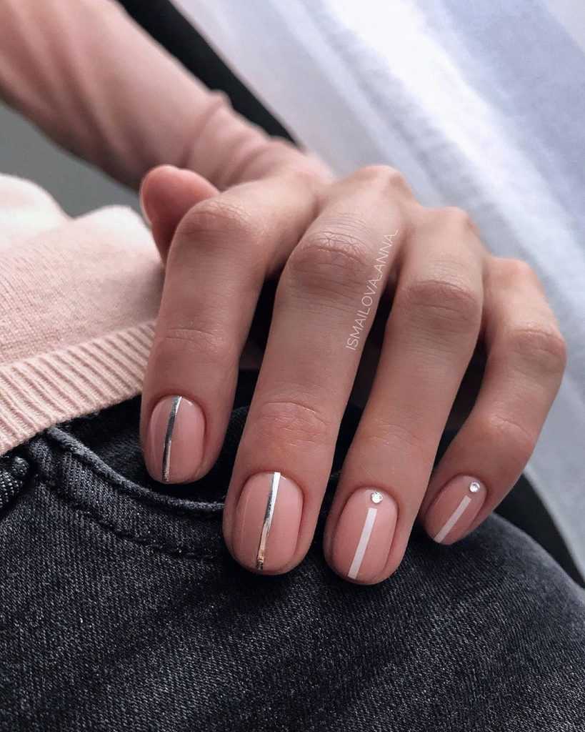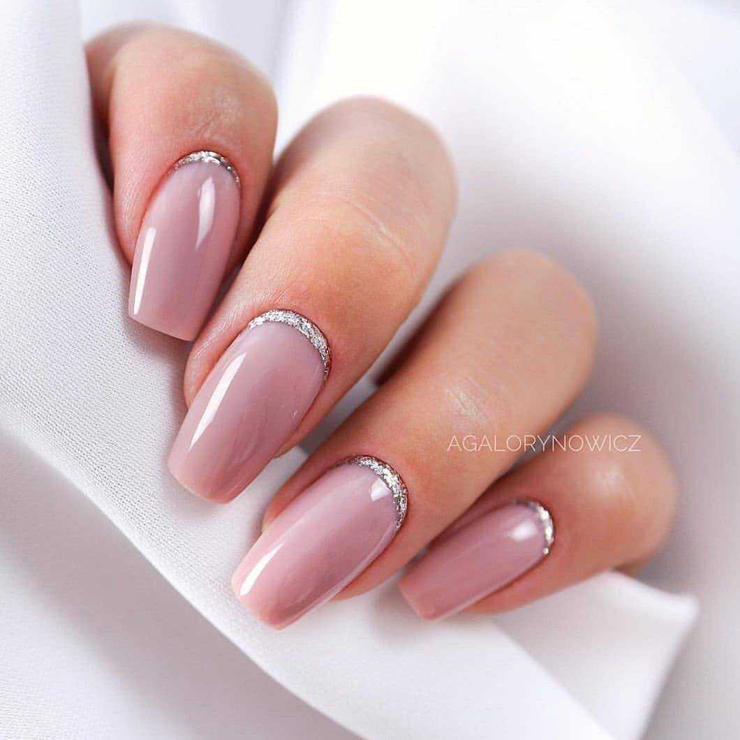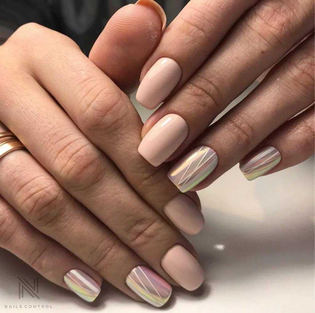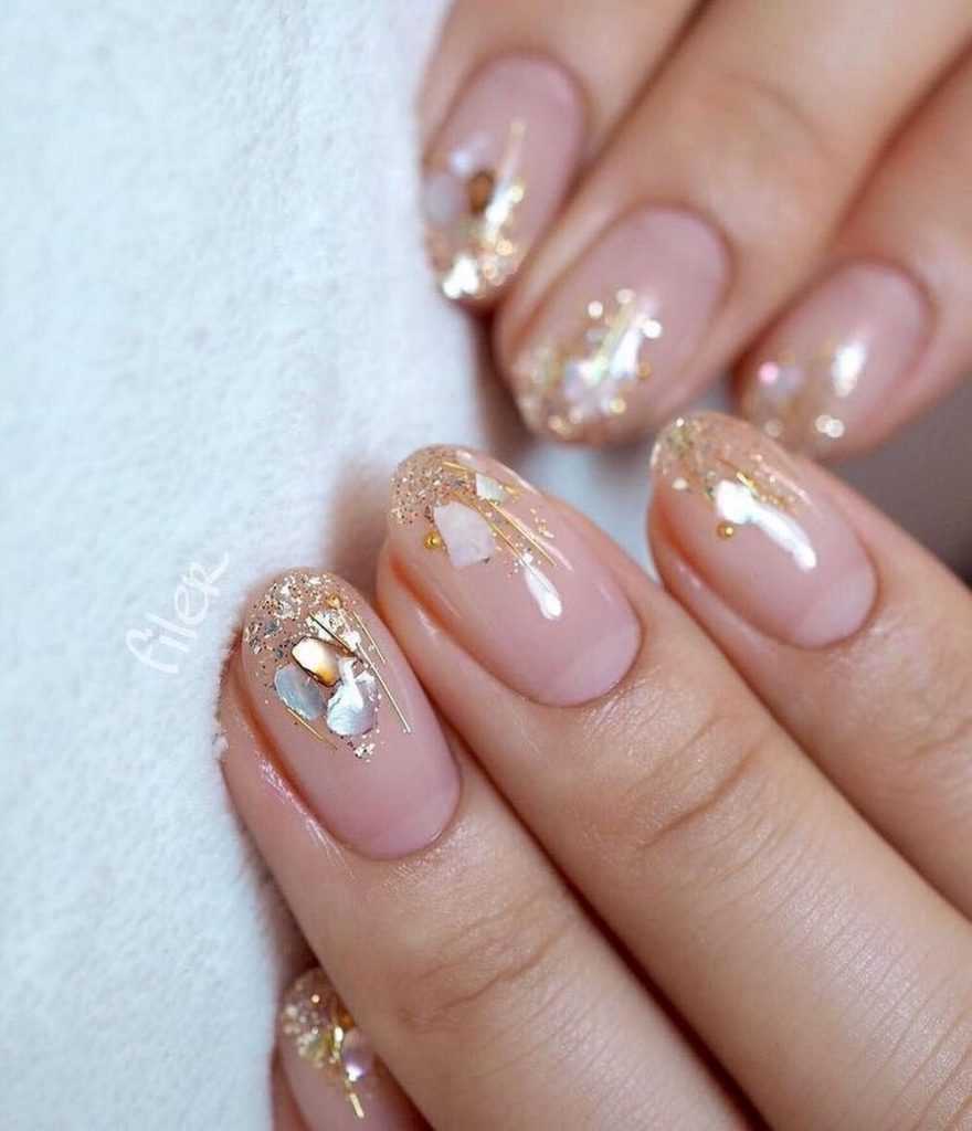 Для создания изысканного дизайна ногтей в виде «голый» маникюр 2019-2020 года смело используйте полоски, фольгу, блестки, камифубуки и камни, а также воспользуйтесь роскошным матовым покрытием и втиркой.