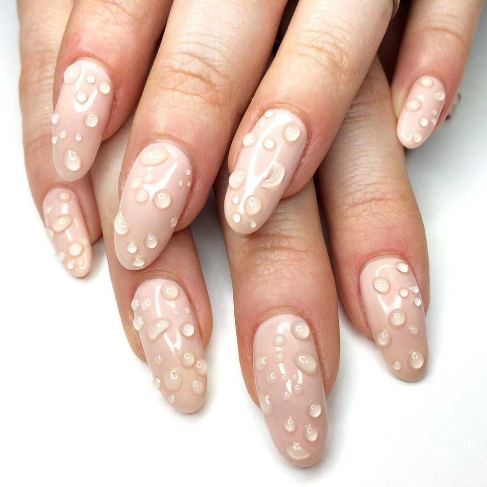 Главная особенность такого маникюра — то, что ногтевая пластина смотрится, будто покрытая стеклом или плёнкой воды. А еще то, что внешняя часть покрытия гладкая. Весь рисунок, каким бы толстым слоем не использовалась для него краска, наносится вначале на покрытый грунтом ноготь .