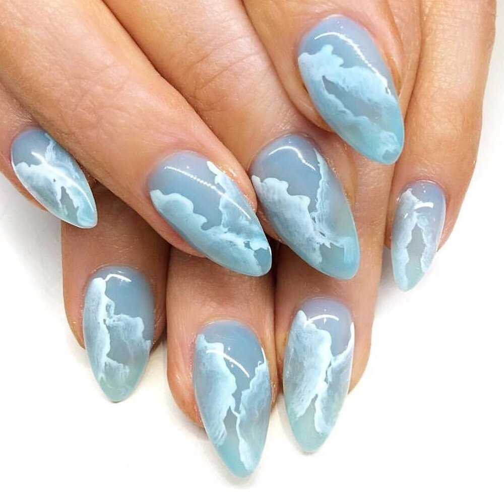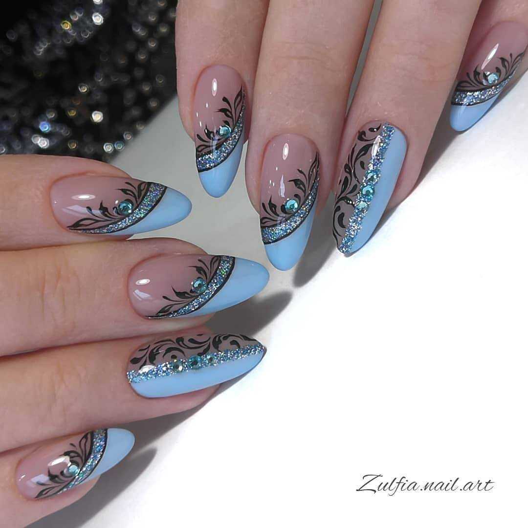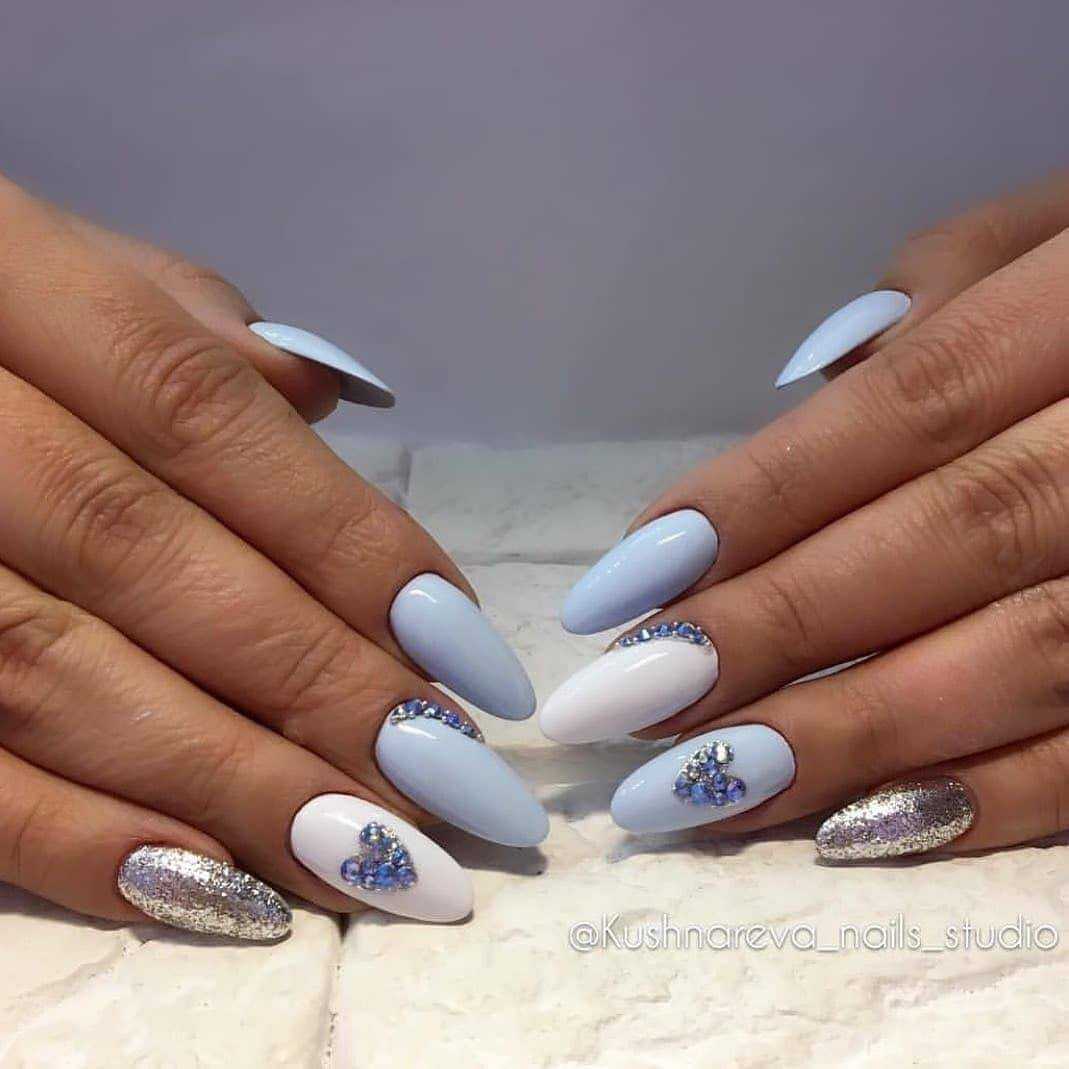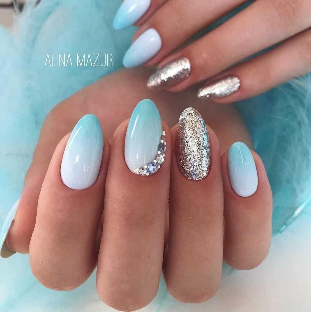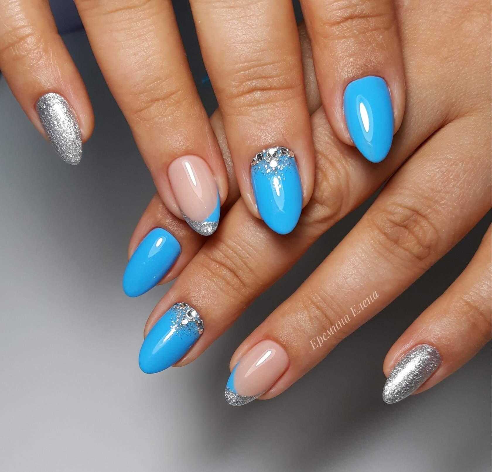 Голубой прекрасно сочетается с белым, нежно-желтым или розовым. Этот цвет часто используют в новогоднем варианте нейл арта.