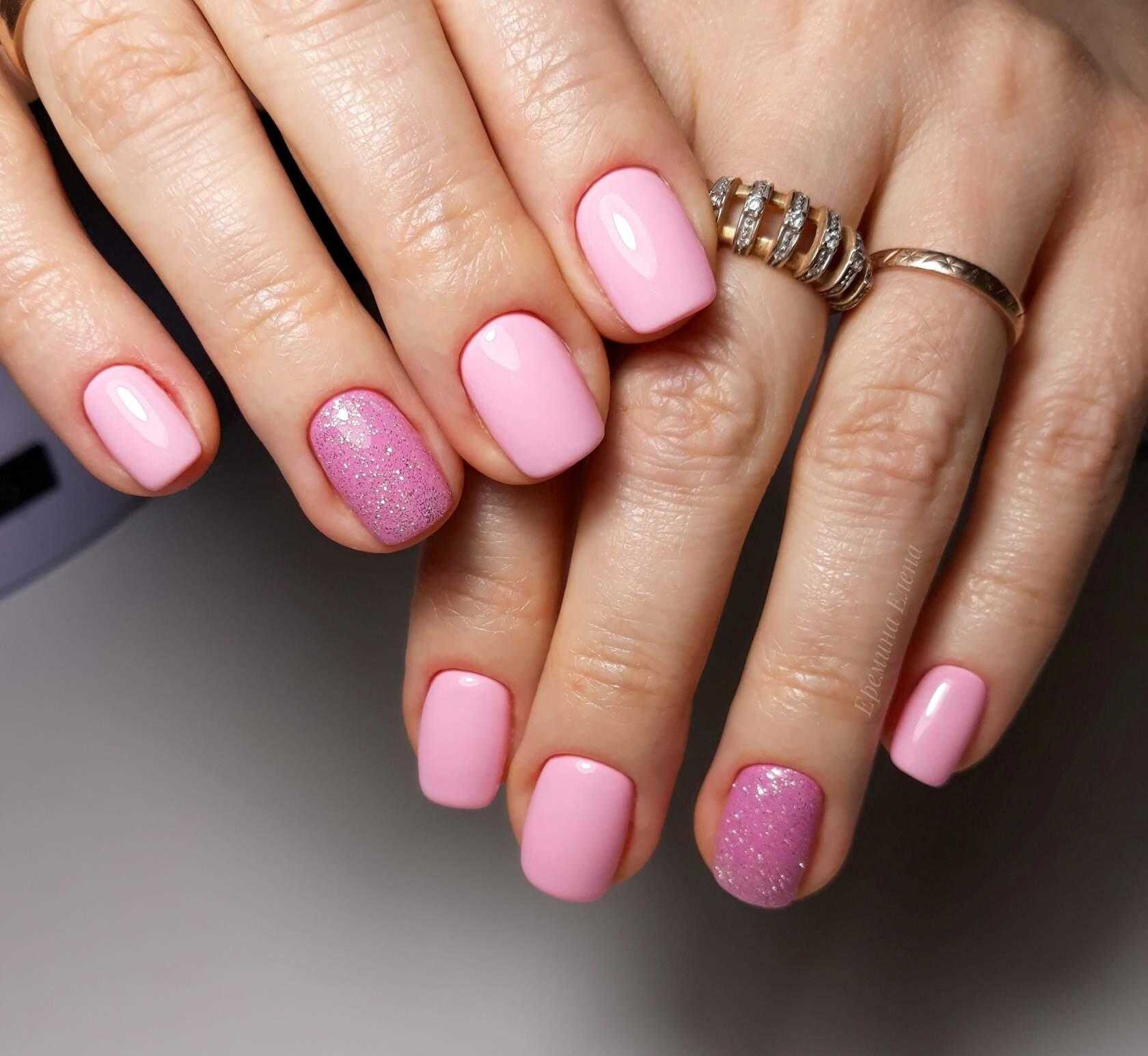 Романтизм такого оттенка трудно переоценить. Когда девушке хочется нежности, легкости и красоты, она начинает выбирать тот самый розовый из всех его оттенков. Нежно-розовый тон на короткую длину ногтевой пластины будет беспроигрышным вариантом.