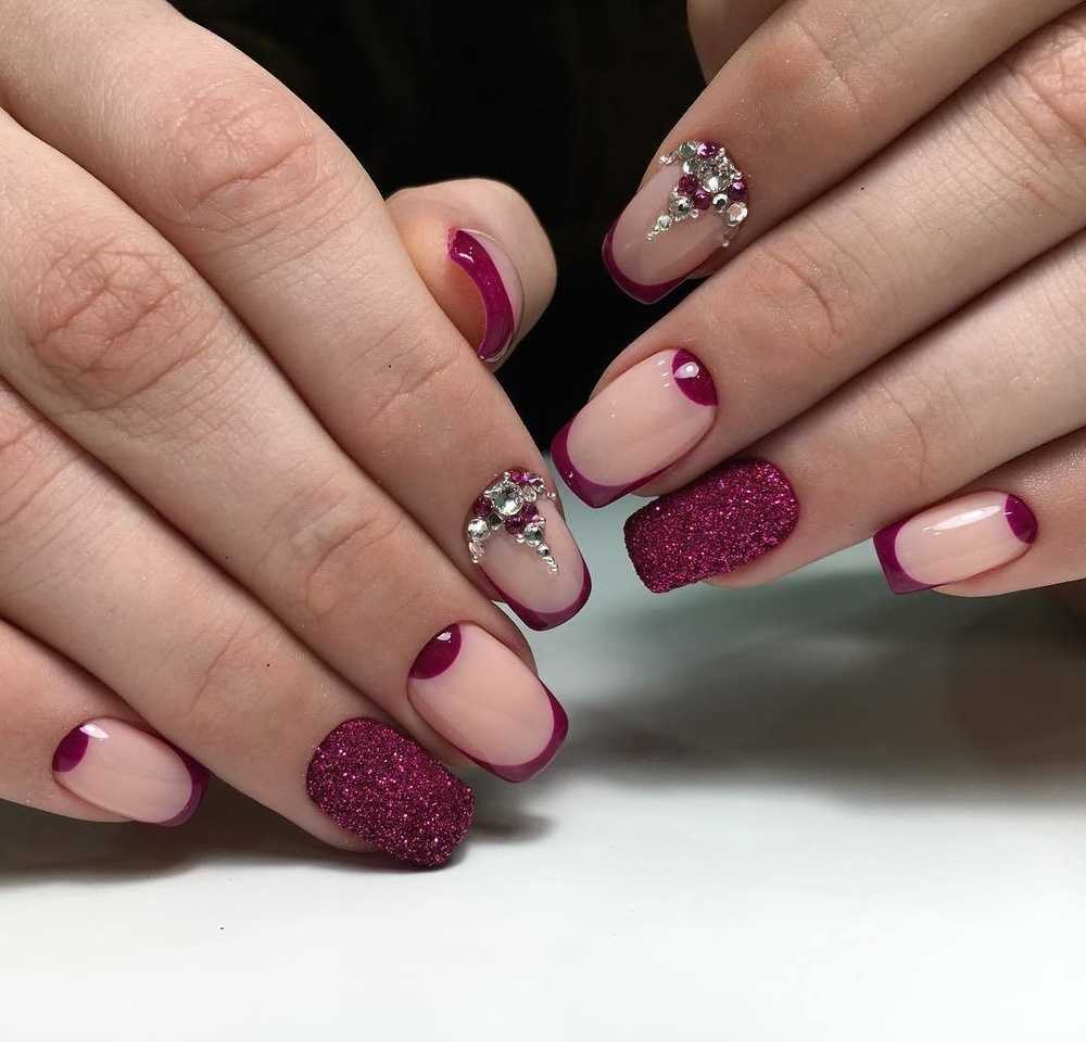 - прозрачные участки ногтя можно дополнительно декорировать на свое усмотрение (узоры, полоски, стразы, блестки).