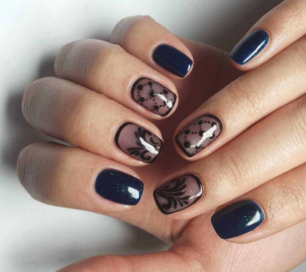 На прозрачном маникюре с рисунком в любое время года изящно и модно выглядят ажурные узоры.