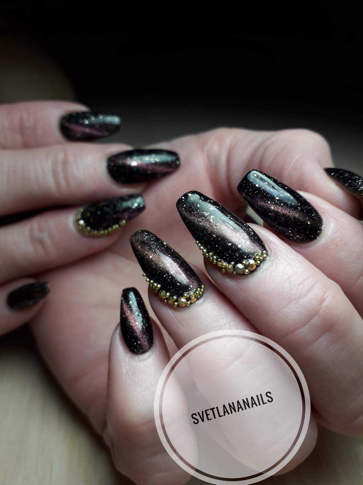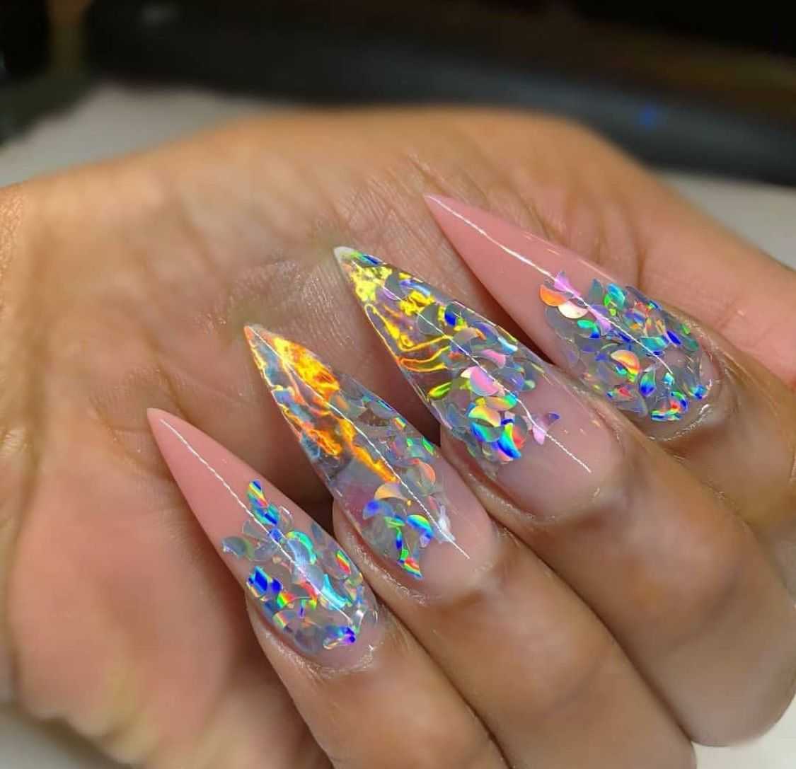 Жидкий — выглядит как обычный лак для ногтей с добавлением большого количества сияющих частиц. Чаще всего это переработанная фольга разных оттенков.