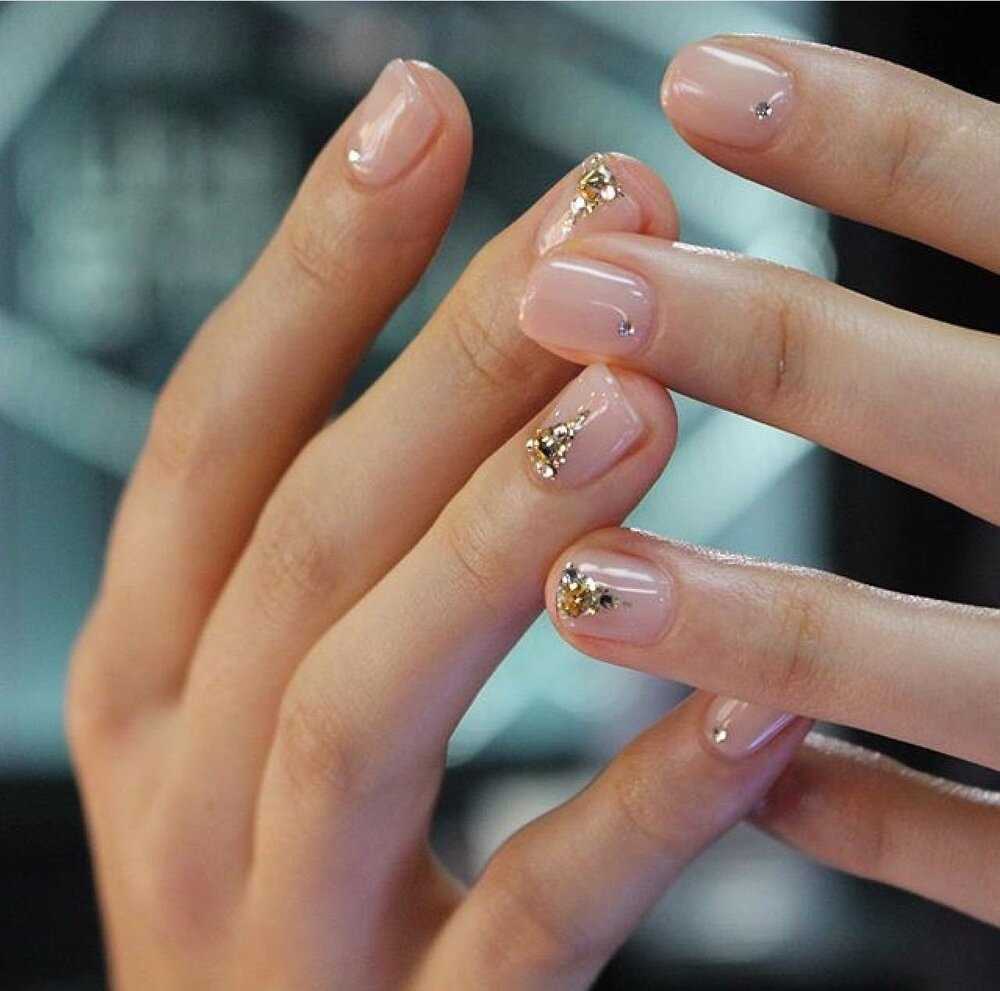 Золотые нити и маленькие стразы, бусинки и камушки позволят выполнить изумительный дизайн ногтей «negative space», что особенно мило выглядит на короткие ногти.