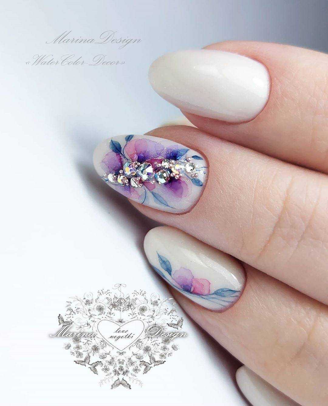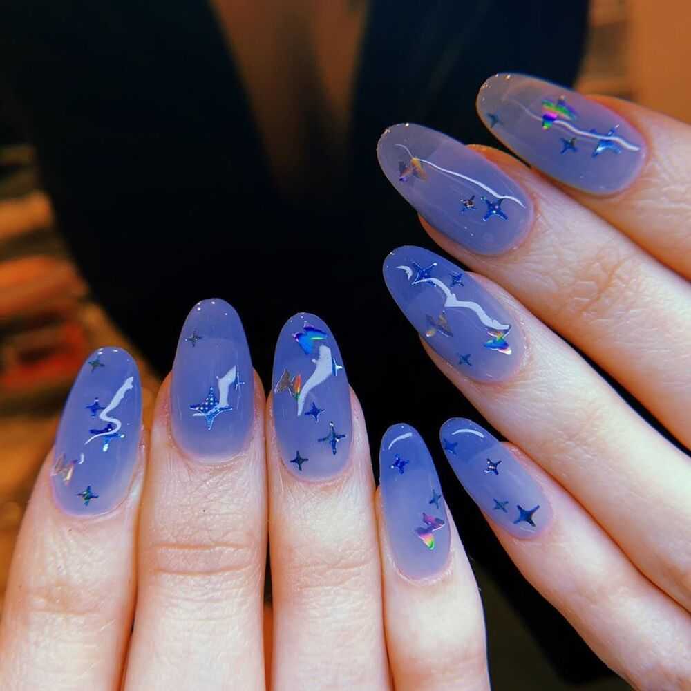 Вдохновляющими станут нейл-арты в лиловом и фиалковом, мятном и персиковом, пудровом и молочном, а также голубом оттенках. Смелым решением станет дизайн с камифубуки, кристаллами, фольгой, «negative space».