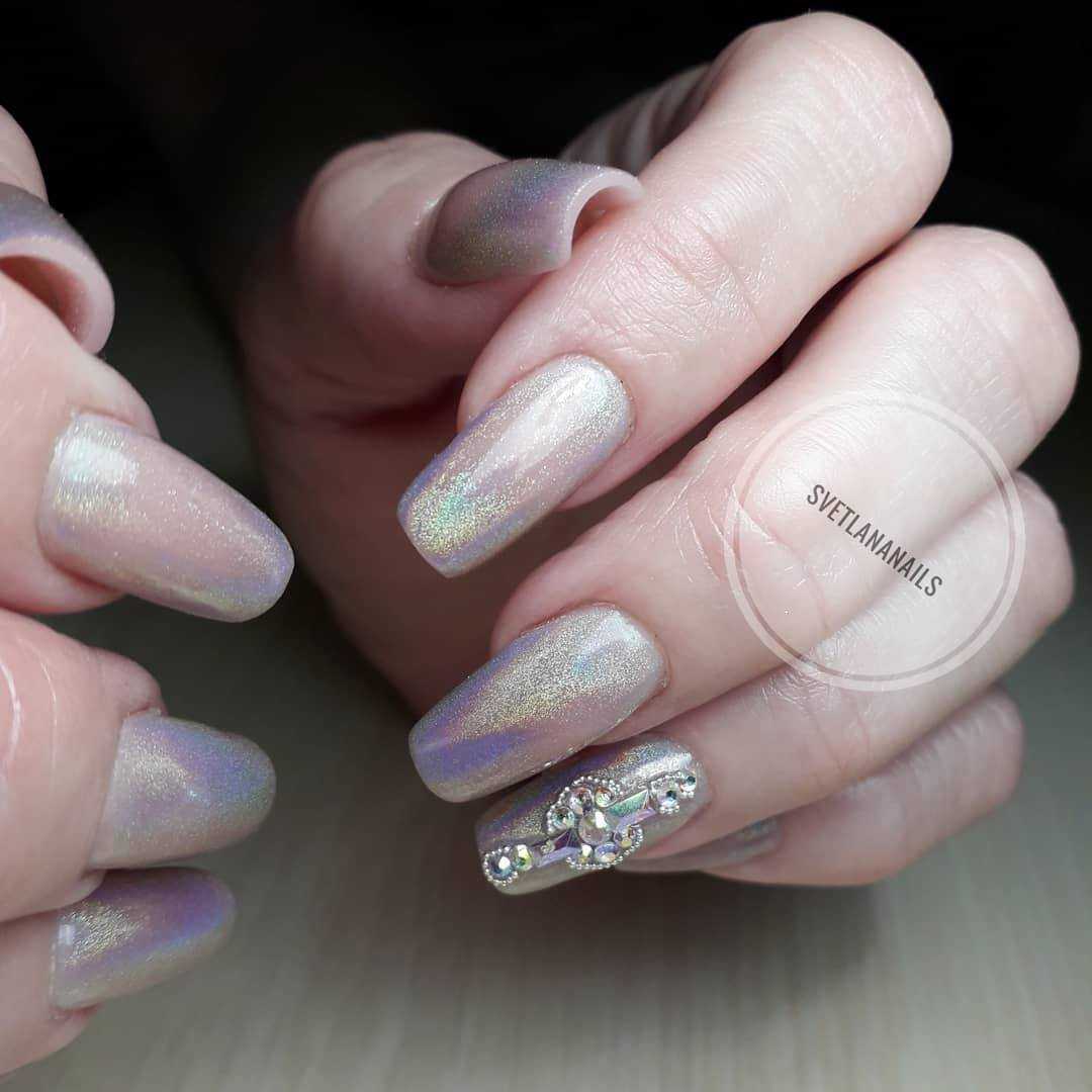 Довольно прост в работе, сделать сияющее покрытие на ногтях можно даже в домашних условиях. Кстати, для вдохновения можно ознакомиться с идеями маникюра с глиттером.