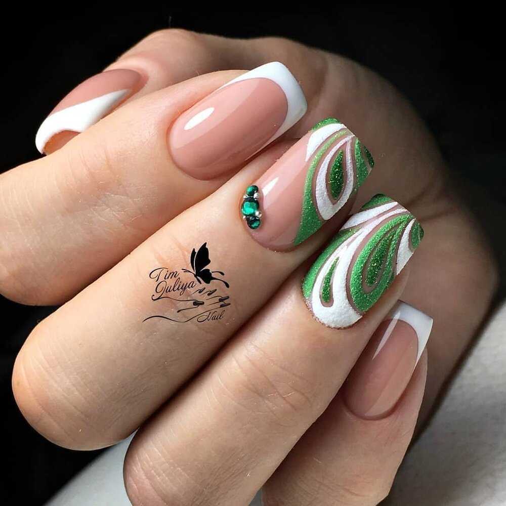 Светло-зеленые тона выбирают не так часто, что совершенно зря. На коротких ногтях его можно сочетать с лунками, выполнить в матовом покрытии или использовать камифибуки. В любом случае, специалист поможет подобрать выигрышный вариант исполнения маникюра именно в таком оттенке.