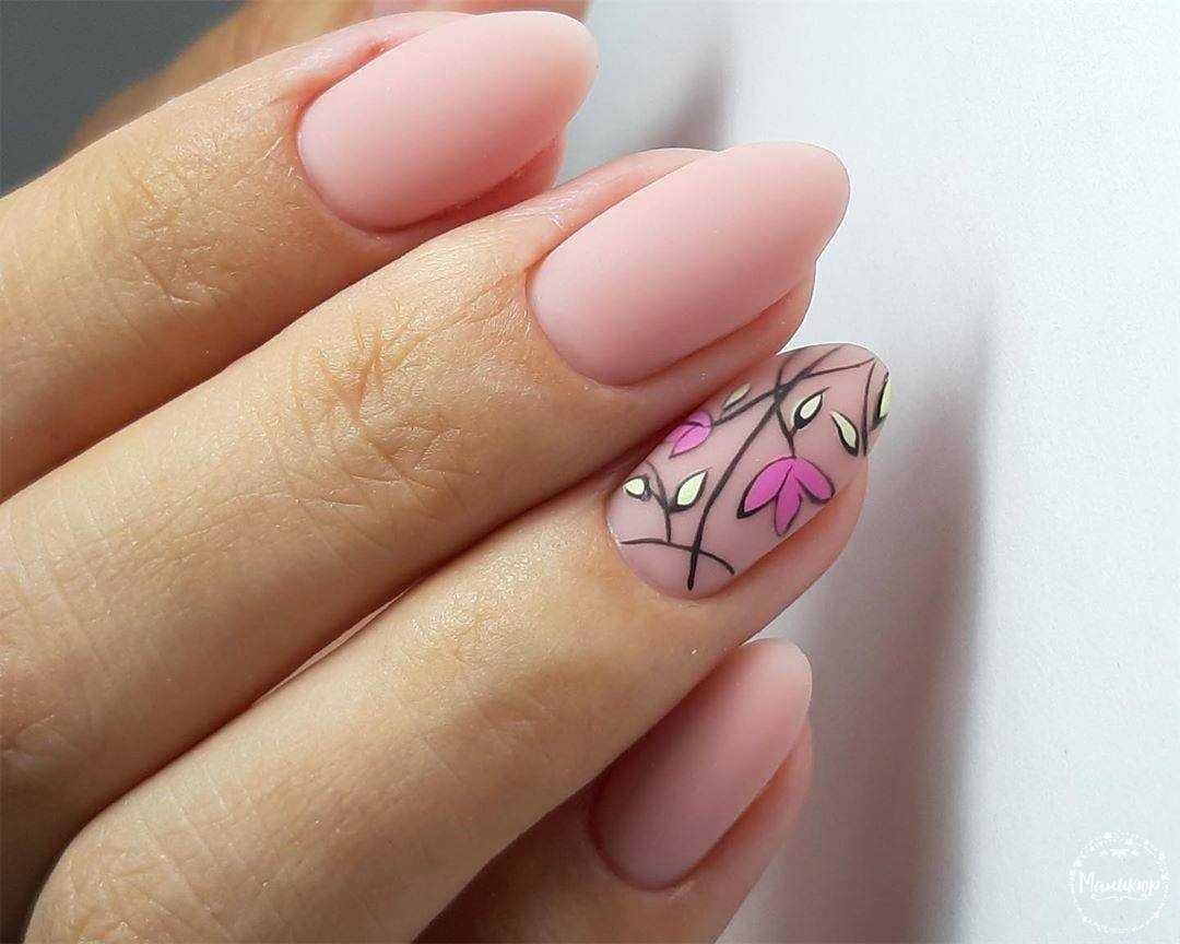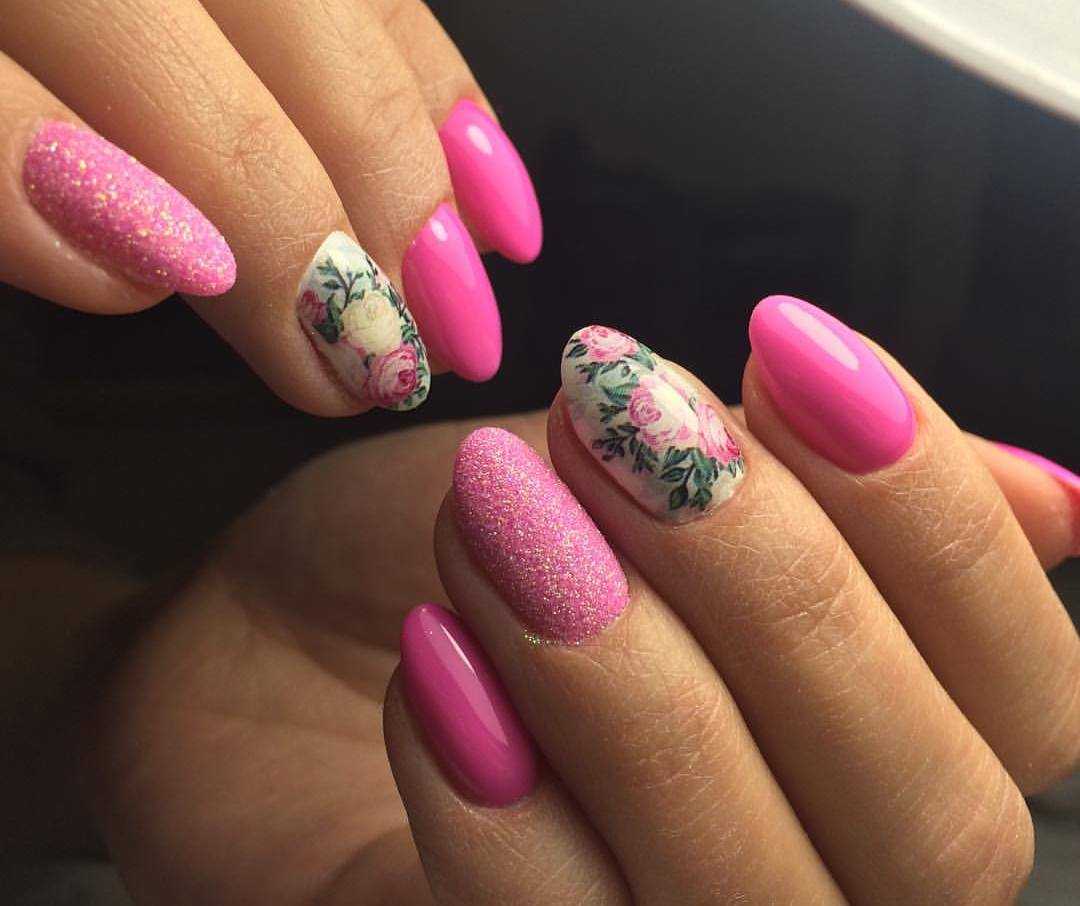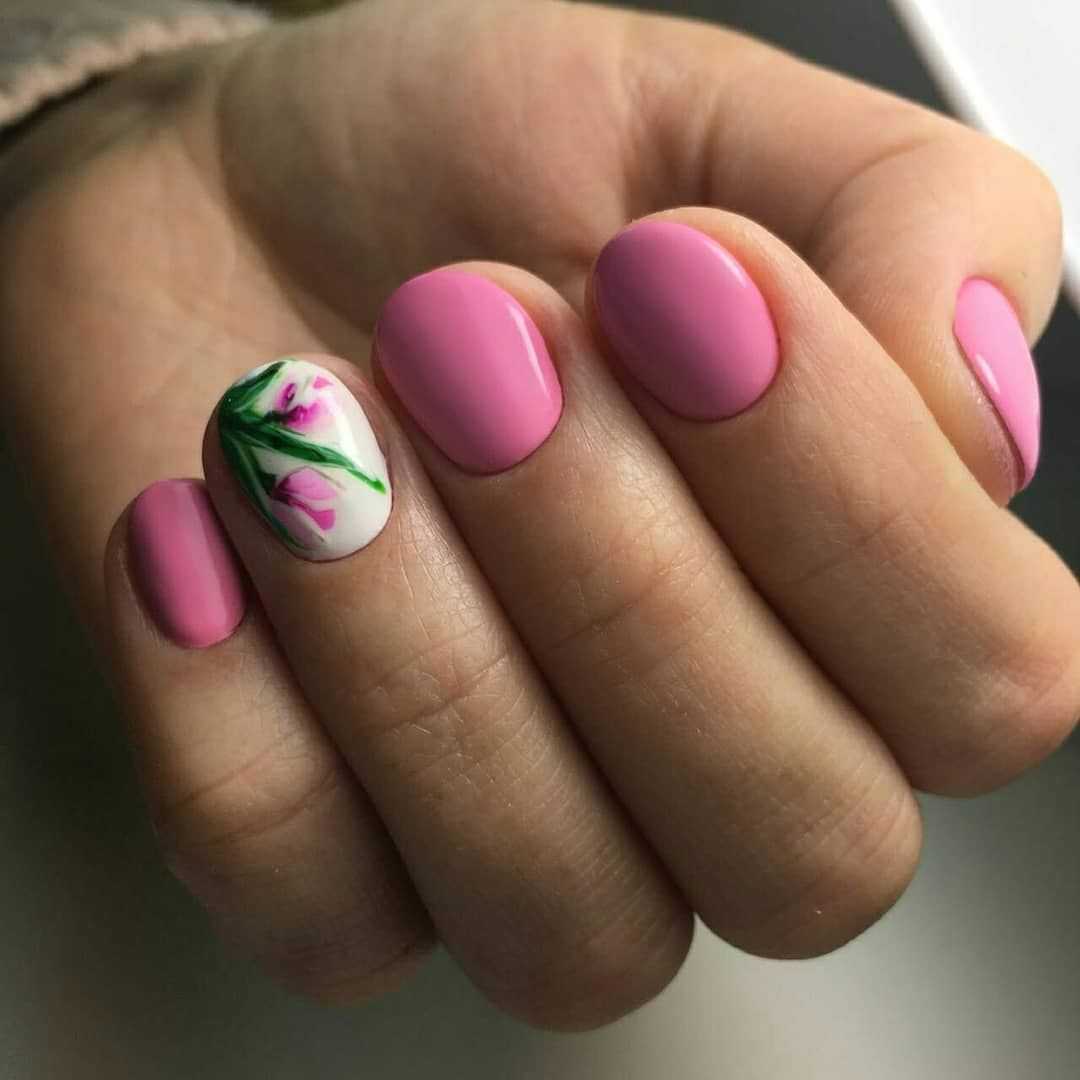 Эффектно розовый маникюр смотрится в сочетании с цветочными мотивами. Цветы всегда выглядят нежно и женственно на ногтях. Они вне конкуренции в любое время года. Особенно хорошо на розовом фоне смотрятся пионы, розы и полевые цветы. Их рекомендуется наносить на один или два пальца. Такой дизайн элегантен и сдержан, но невероятно шикарен.