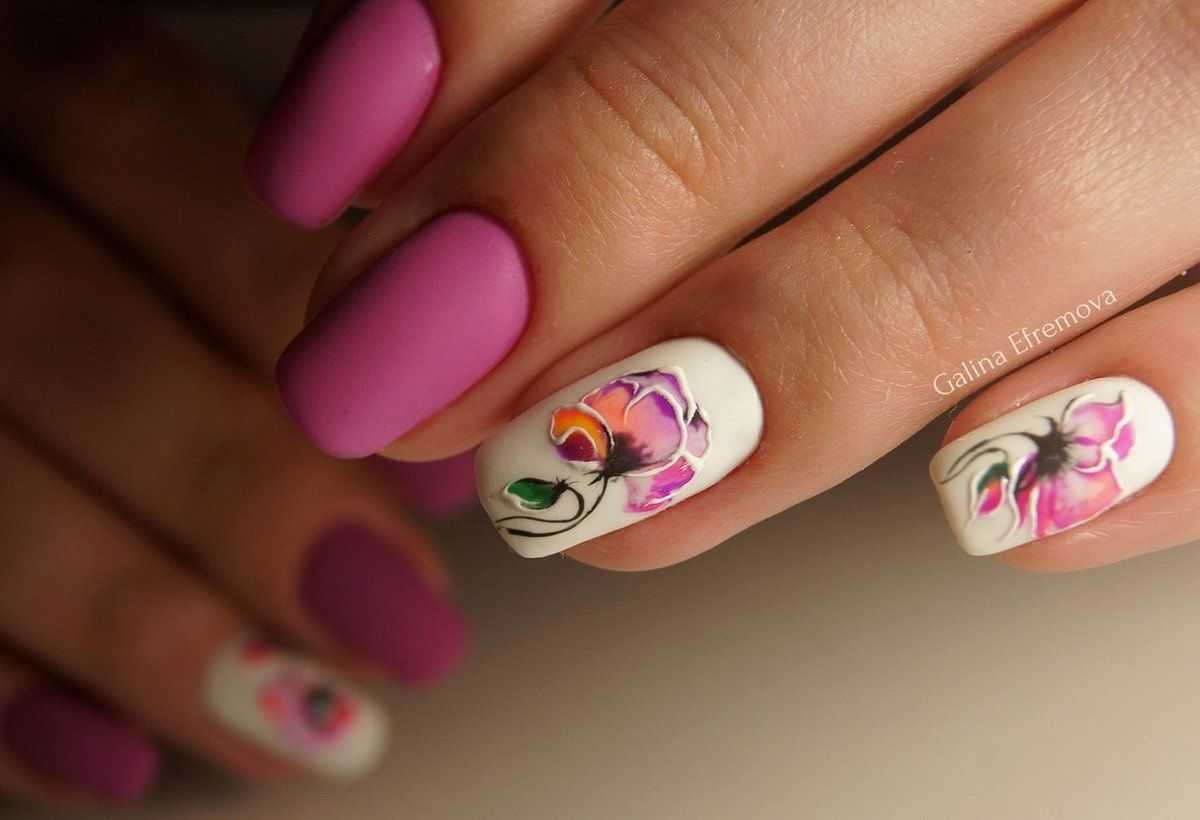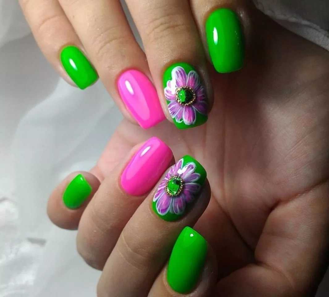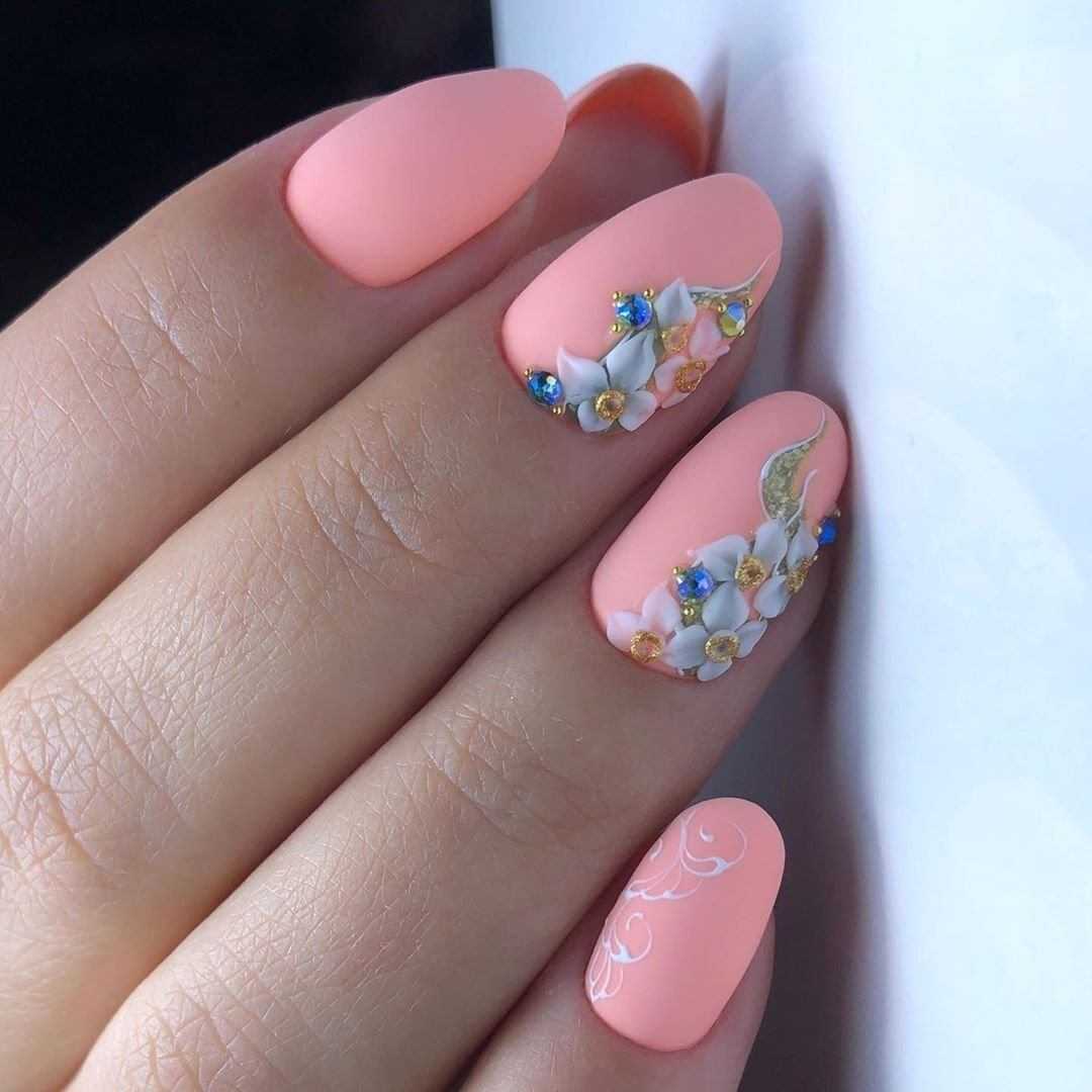 Эффектно розовый маникюр смотрится в сочетании с цветочными мотивами. Цветы всегда выглядят нежно и женственно на ногтях. Они вне конкуренции в любое время года. Особенно хорошо на розовом фоне смотрятся пионы, розы и полевые цветы. Их рекомендуется наносить на один или два пальца. Такой дизайн элегантен и сдержан, но невероятно шикарен.