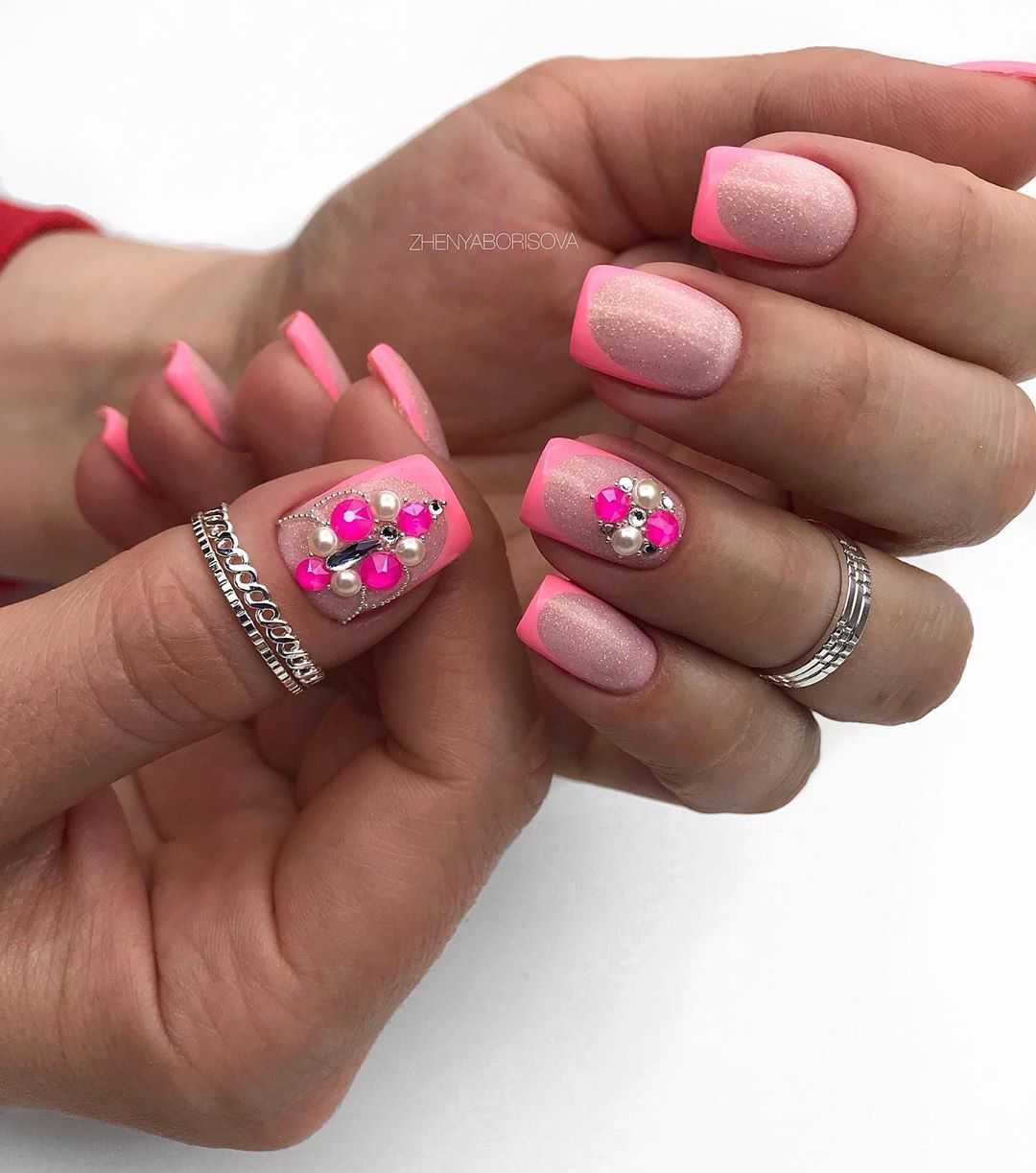 Если вы собираетесь сделать праздничный розовый маникюр, можно поэкспериментировать с элементами декора. В моде стразы, камифубуки, пайетки, блестки и бусинки — их можно добавлять как на один ноготь, так и на несколько. Но не переусердствуйте! Декор в большом количестве делает маникюр вульгарным, это смотрится глупо и вызывающе.