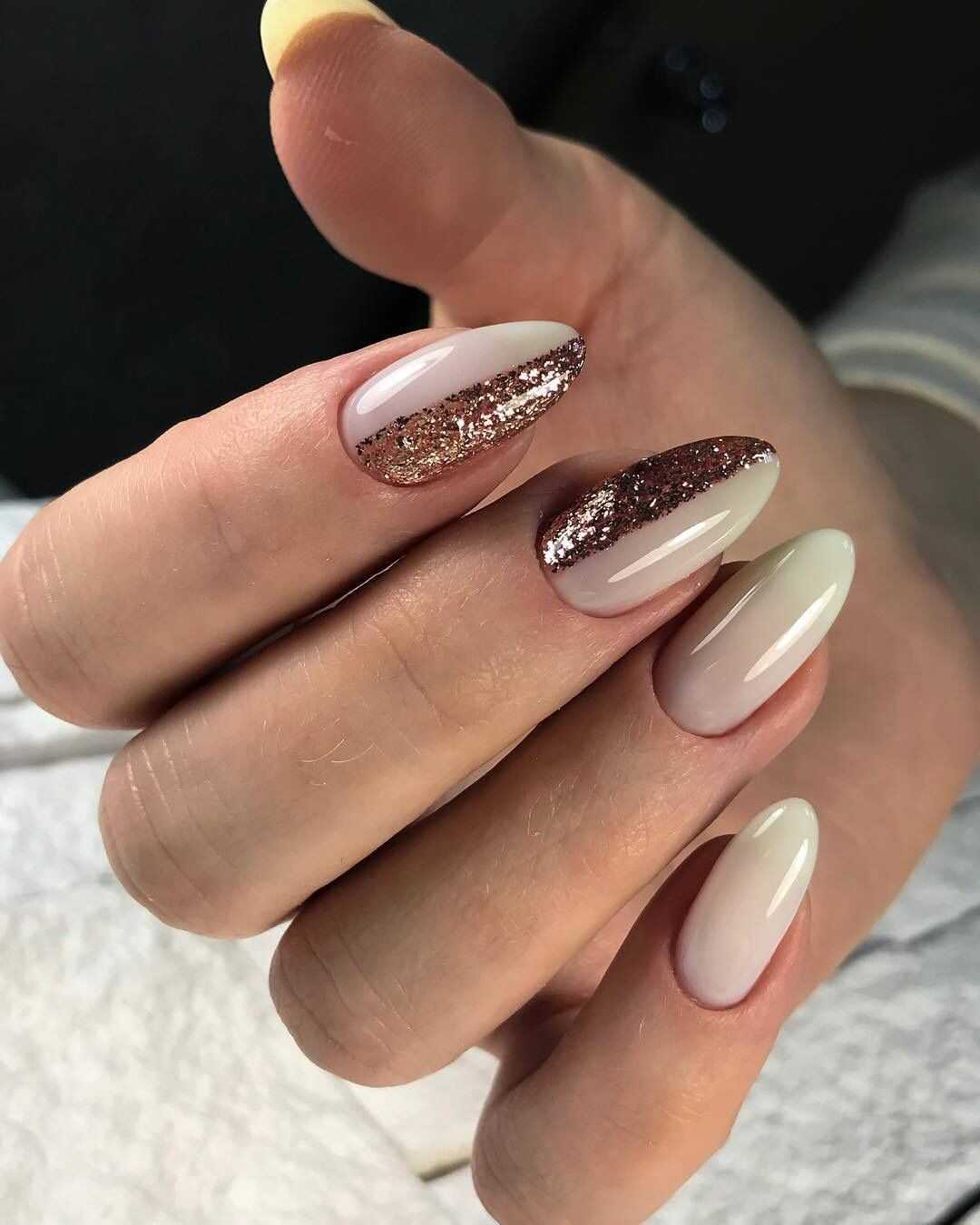 Для этого, следуя инструкции выше, сделайте пудровый маникюр и нанесите матовый топ. Затем его сушат в лампе. Далее вам понадобится тонкая кисть с длинной щетиной и густой золотой лак. Нарисуйте треугольный конец ногтя по контуру и высушите. Теперь нужно аккуратно нанести финишный гель-лак с эффектом глиттера в золотистом оттенке. Проще всего это сделать с помощью отдельной кисти.