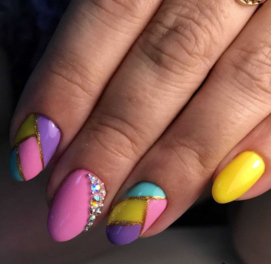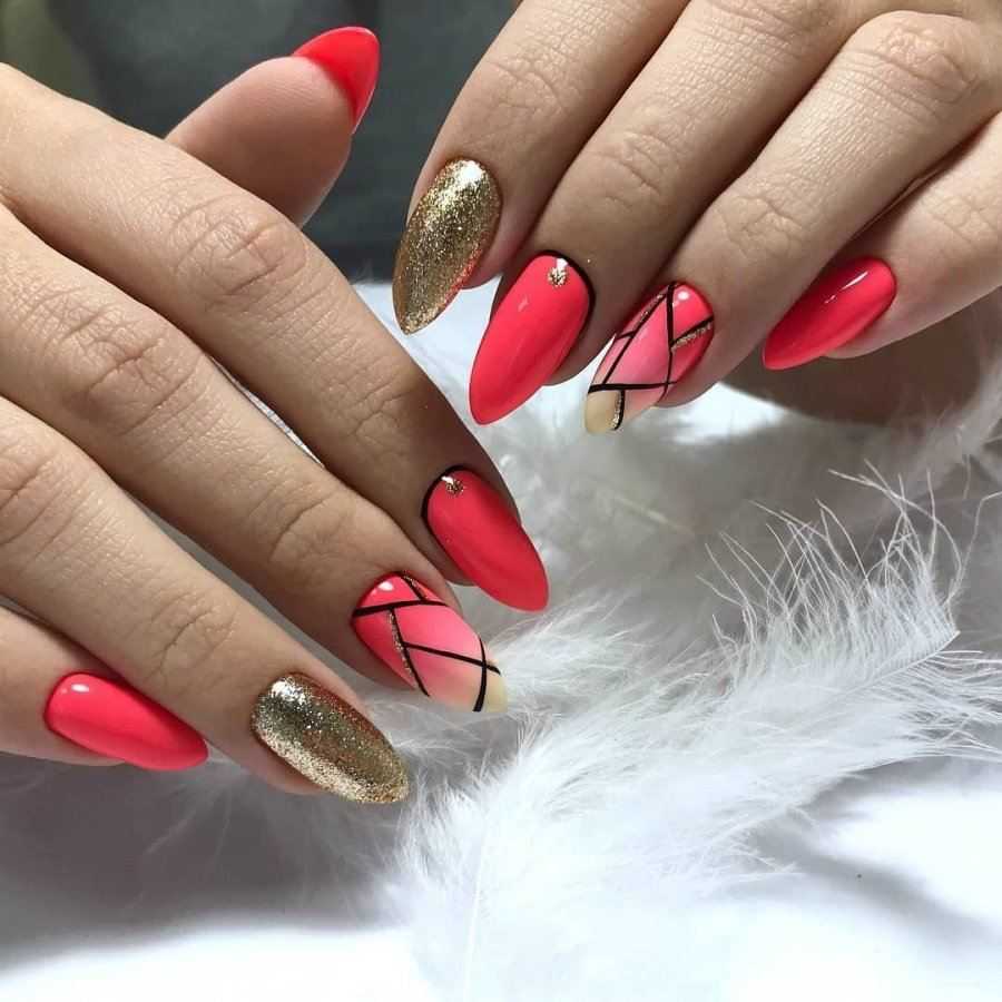 Одной из шикарных идей считается сочетание розового с золотыми нотками. Это может быть золотистый лак, глиттерные блёстки, золотые конфетти или пайетки. Для оформления подобного дизайна актуальнее отдать предпочтение светлым, пастельным покрытиям или розовым полупрозрачным лакам. Яркие и неоновые цвета лучше оставить для других вариантов. Вы можете оформлять золотым блеском узоры и рисунки на ногтевых пластинах или акцентировать золотистым сиянием несколько пальчиков. При оформлении маникюра с использованием перламутровых розовых лаков увлекаться золотыми деталями не стоит.