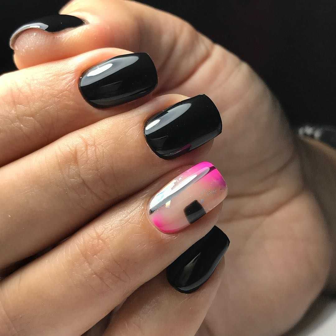 Необычное решение — дизайн черных ногтей 2023 в сочетании с фрагменарным радужным градиентом. Интересный вариант и Омбре с переходами от светлого к темному и от темного к светлому на разных ноготках одной и той же руки.