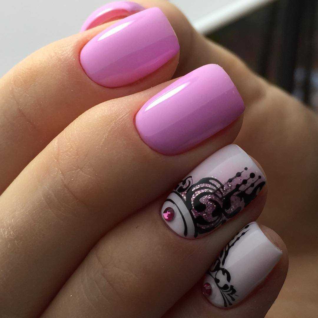 Подобная идея станет прекрасным вариантом для создания нежного и утончённого дизайна. Предложенные оттенки очень красиво сочетаются между собой в различных техниках и способны стать дополнением любого женского образа. Изящность маникюра при этом не зависит от блеклости или насыщенности розового цвета. Одними из распространённых примеров розово-белого дуэта являются френч, лунный маникюр и однотонные покрытия с рисунками цветов. Узоры могут быть белыми на розовой основе или наоборот, розовые на белых ноготках. Также подобные идеи очень красиво дополняются полосками глиттера или камушками.