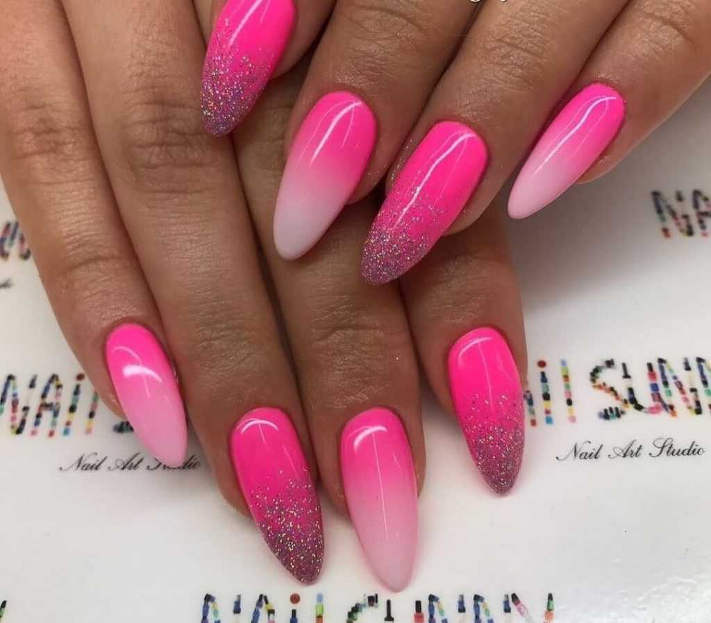 Маникюр розового цвета с омбре и градиентом можно оформлять в похожих оттенках, и разных. Наилучший эффект достигается выбором контрастных цветов. Дизайну можно украсить блестками, небольшой полоской прозрачного лака или стразами.