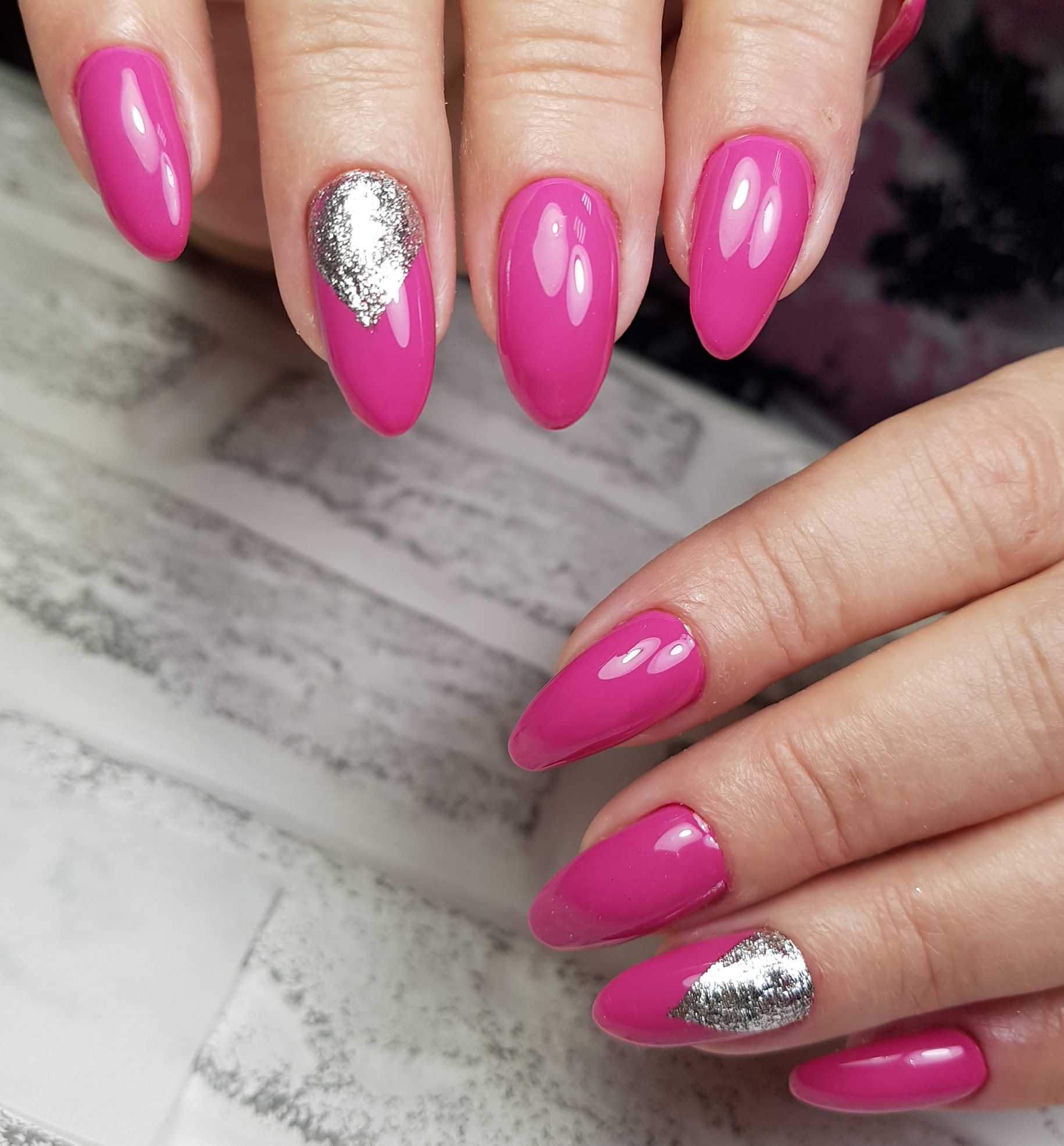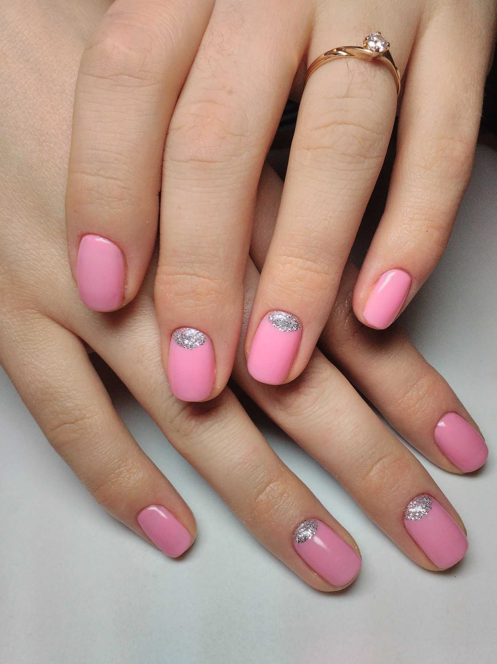 Аккуратные линии серебром или выделение лунок подчеркивают розовый цвет. Серебряное оформление не перегружает дизайн. Подойдет на любой выбранный образ и подчеркнет нежный макияж.