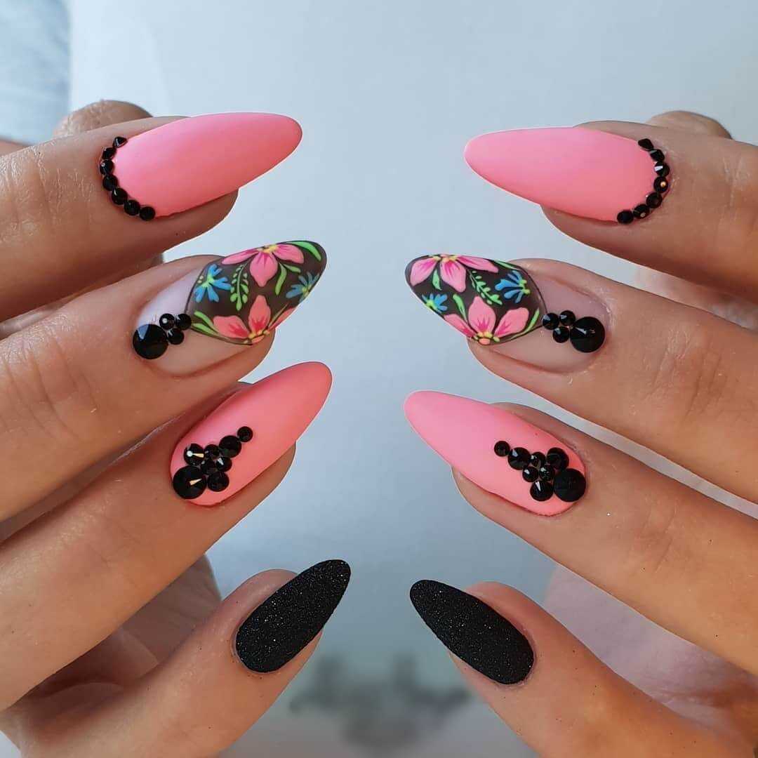 Стразы практически всегда придают нежность и эффектность, если, конечно, с ними не перебор. Блестящие грани придадут любому маникюру налет романтичности. Если камни сверкают на розово-черном фоне, то такой вариант больше подойдет к вечернему выходу.