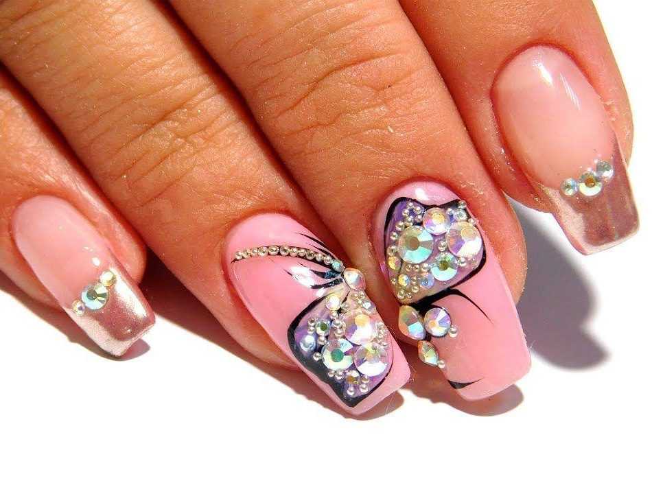 Бабочка на ногтях со стразами – эффектный и выигрышный вариант оформления ноготков. Стразы лучше всего подходят для декора бабочек и стрекоз. Их можно разместить по краям крылышек, вдоль спинки, на кончиках усиков. Форма ноготков может быть любая