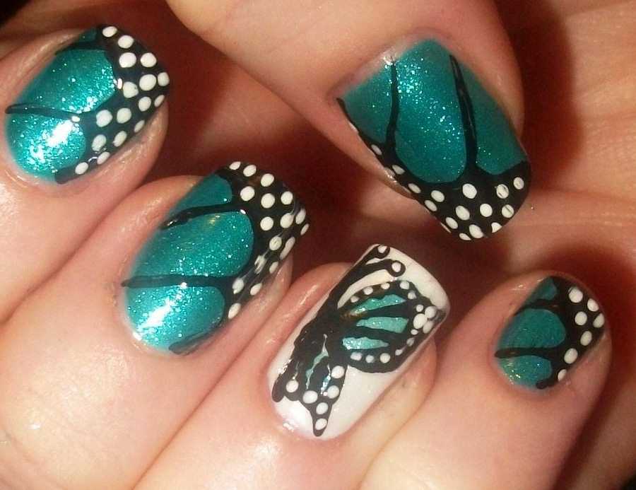 Еще один способ проявить оригинальность – покрыть ноготки узорами, имитирующими расцветку части крылышка бабочки. Такой способ подойдет для создания яркого летнего маникюра.