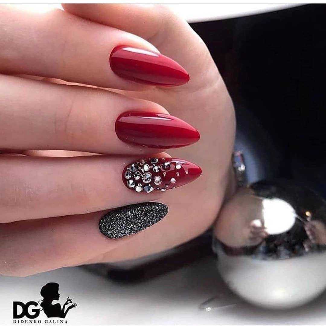 Очень часто блёстки в маникюре дополняются различными видами страз, и подобное оформление, в зависимости от количества сверкающих деталей, может не только дополнять вечерние или праздничные наряды, но и прекрасно уживаться с повседневными и даже строгими образами.