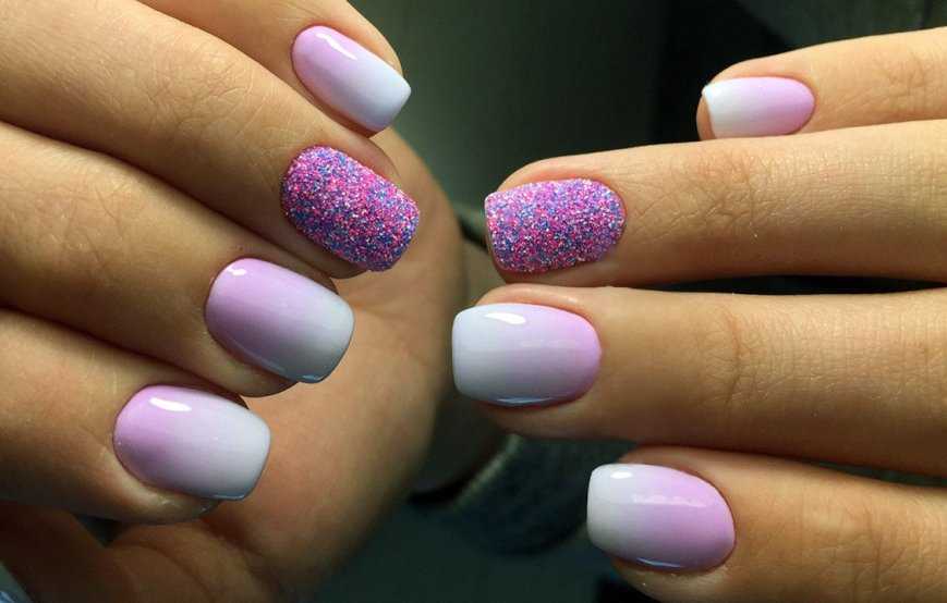 Рассыпные блестки позволяют легко создать эффект деграде (постепенного перехода). Более сложный вариант, сочетающий сиренево-розовый и голубой оттенки лака с цветными блестками представлен на фото ниже.
