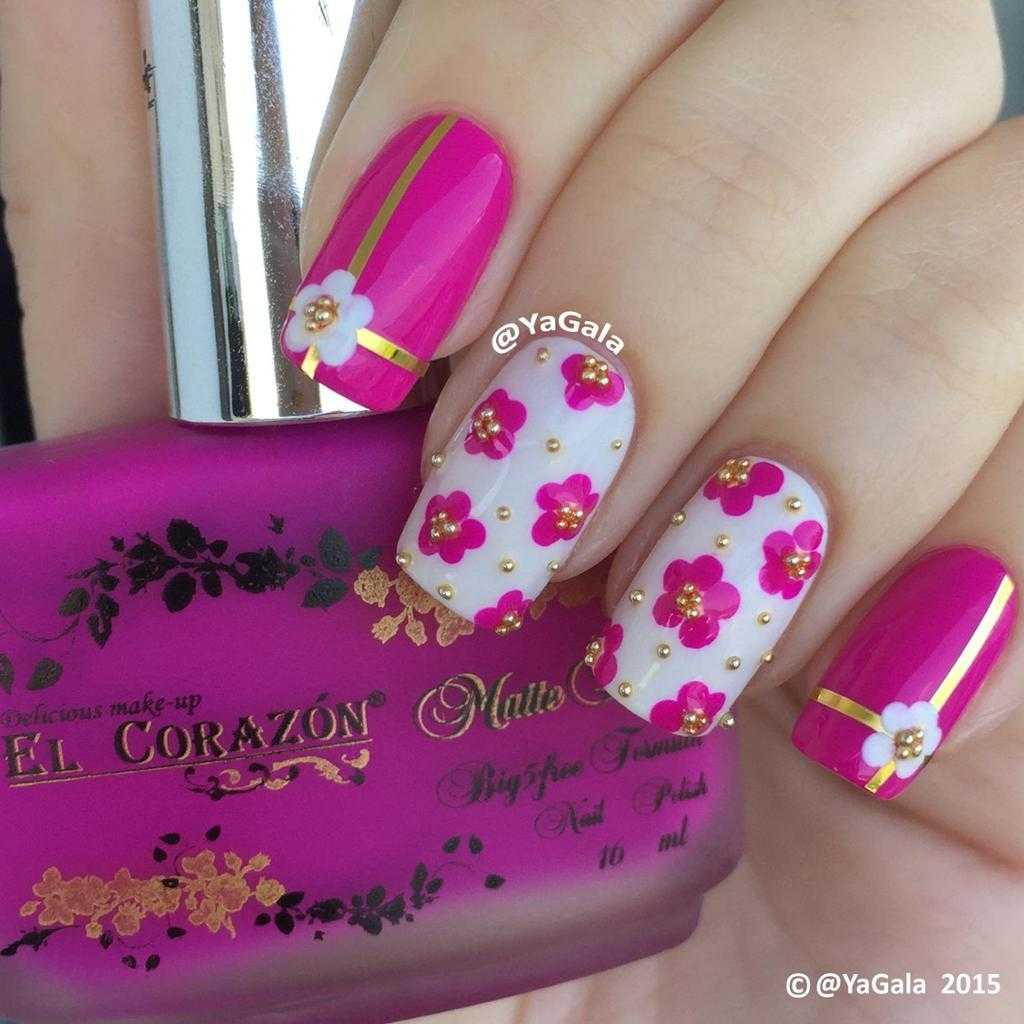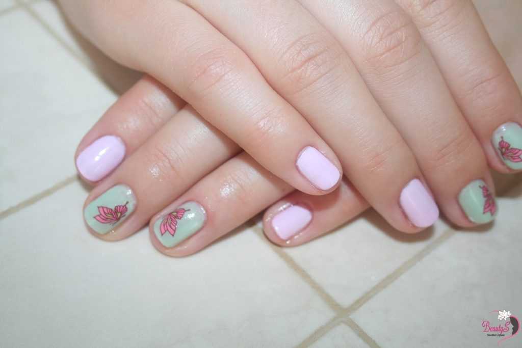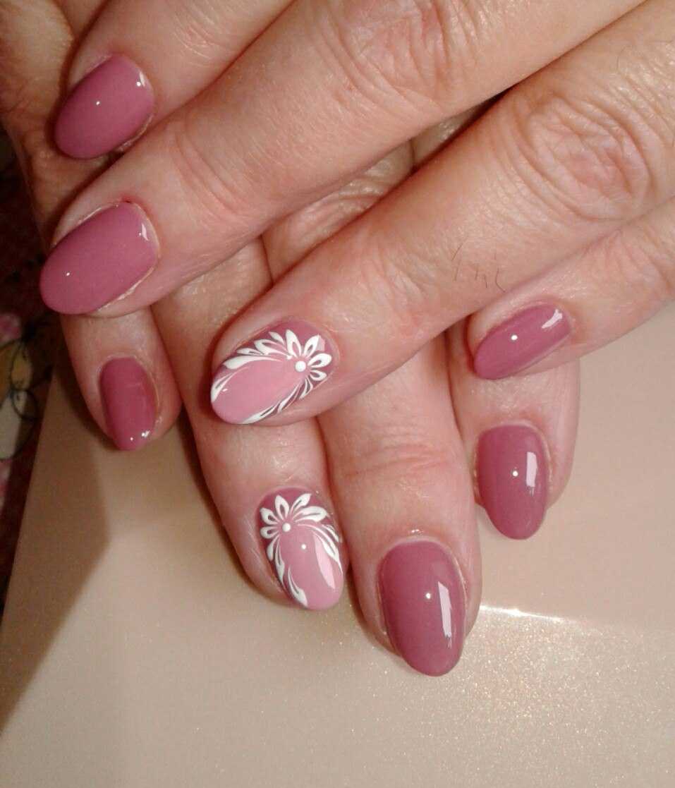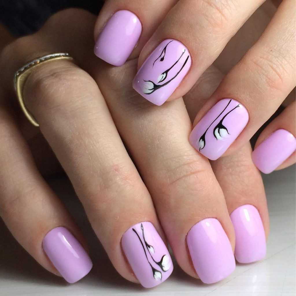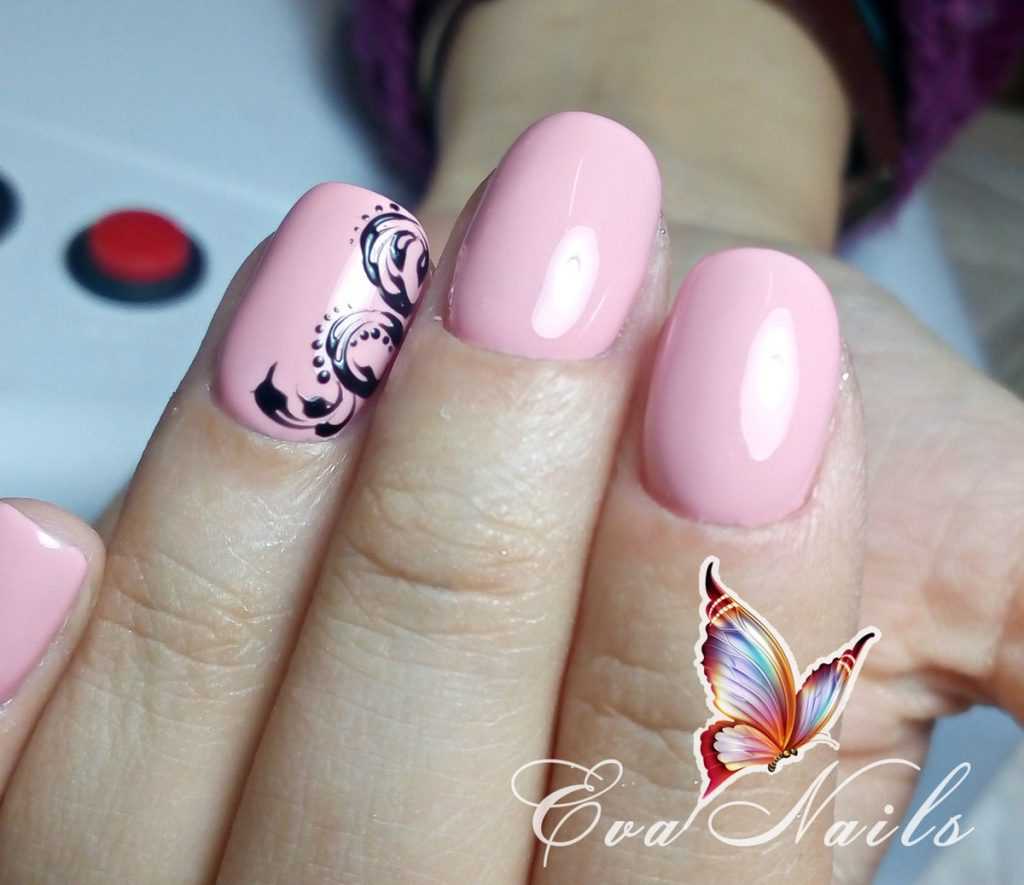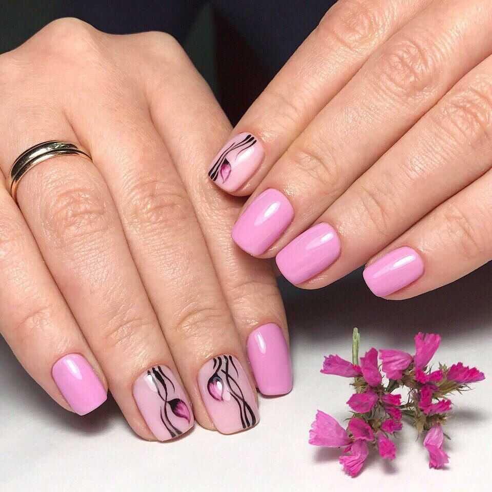 Розовая основа считается самой подходящей для нанесения нежных цветочков или веточек. Такие рисунки лаконичны уже сами по себе и не нуждаются в дополнительном украшении. Однако, при желании, можно дополнить маникюр небольшими стразами. Добавить яркости поможет контрастный лак на соседних ноготках. Розовый неплохо смотрится вместе с мятным или оранжевым.