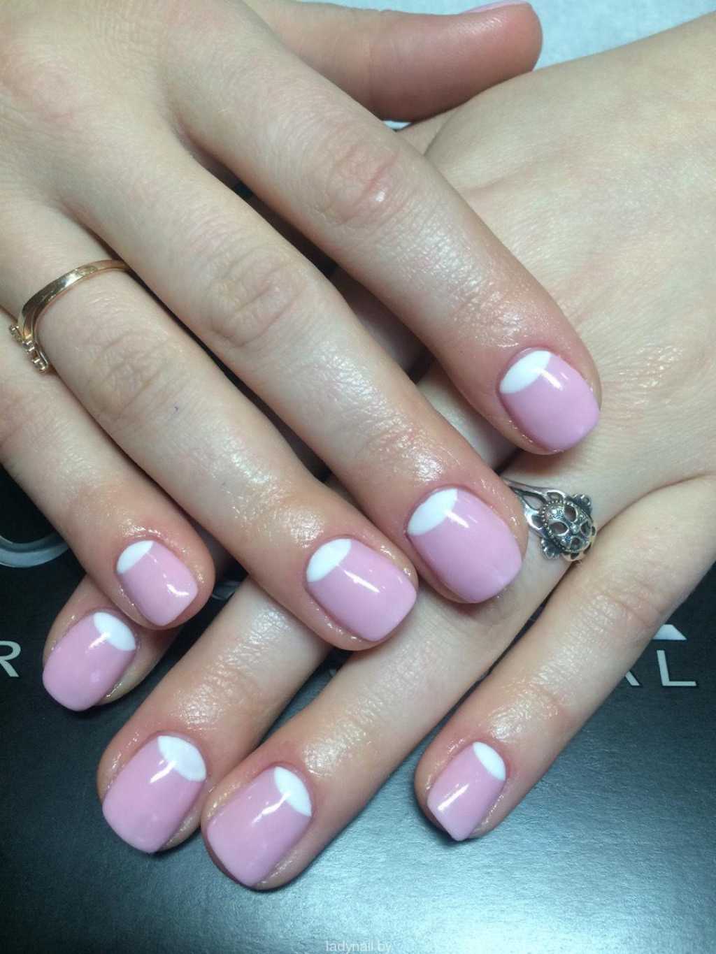 Не безынтересен будет французский маникюр, который допустимо выполнять только несколькими способами: розовый в качестве основы с белым френчем (кукольный дизайн).
