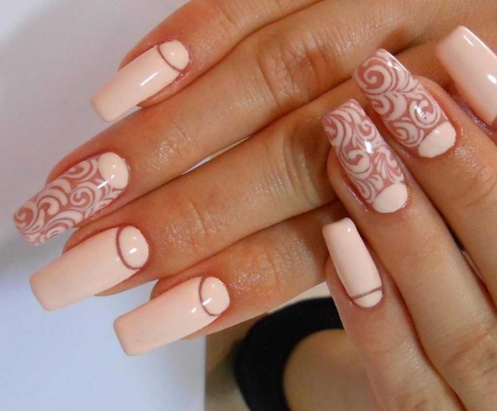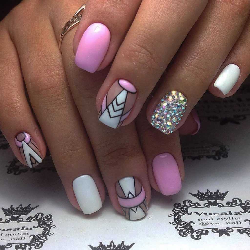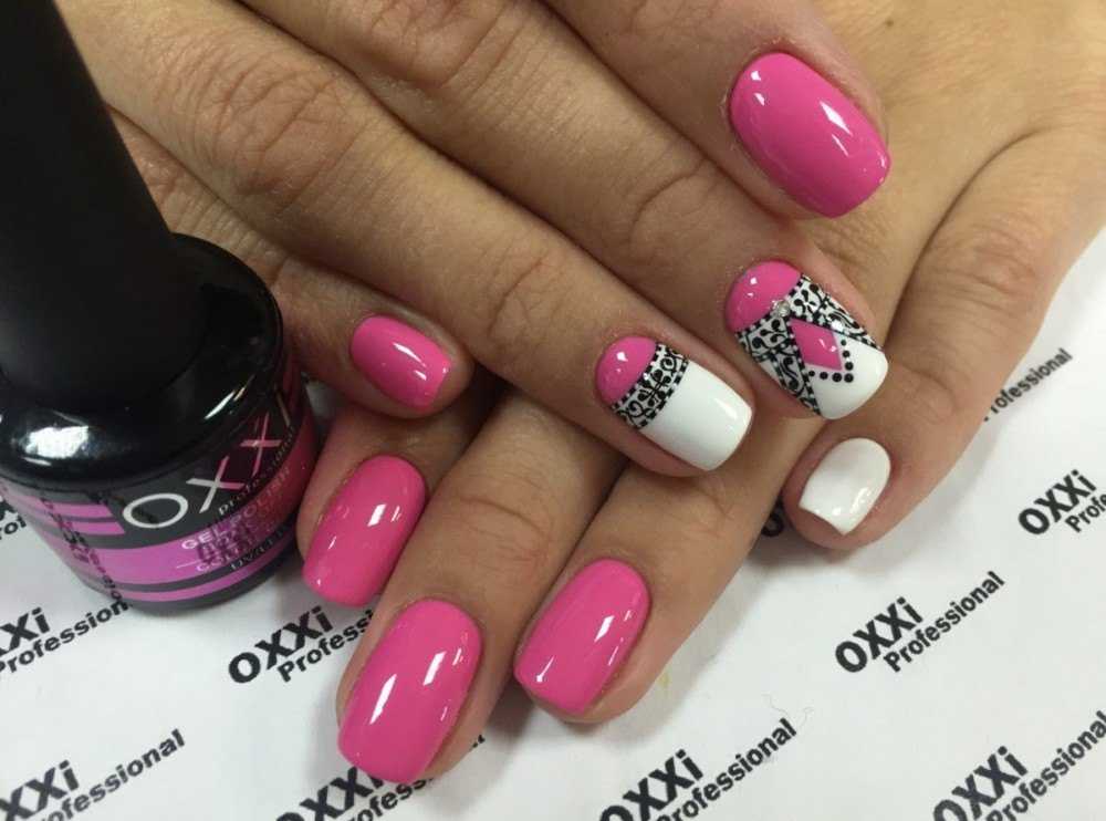 Пожалуй, самый популярное сочетания – это розовый с белым. Такие оттенки хорошо смотрятся не только в качестве французского или лунного маникюра. Существует множество даже более интересных вариантов. К примеру, цветочный или геометрический дизайн. Каждый из них выглядит по-своему красиво и женственно.
