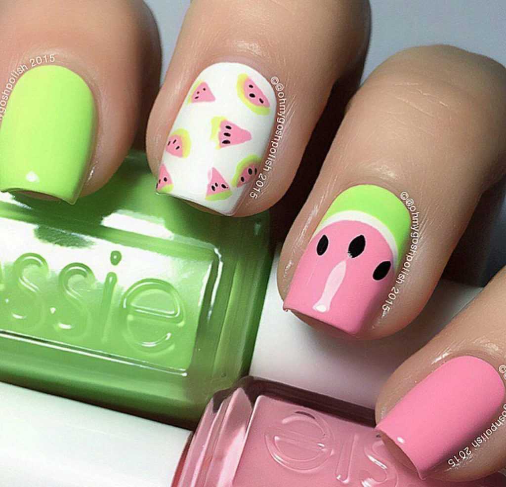 В летнее время, кроме цветов на ногтях можно нарисовать бабочек или любых насекомых. Крылья у бабочки можно украсить стразами или «битым стеклом». Не менее привлекательно на розовых ноготках будут выглядеть сочные фрукты или ягоды.
