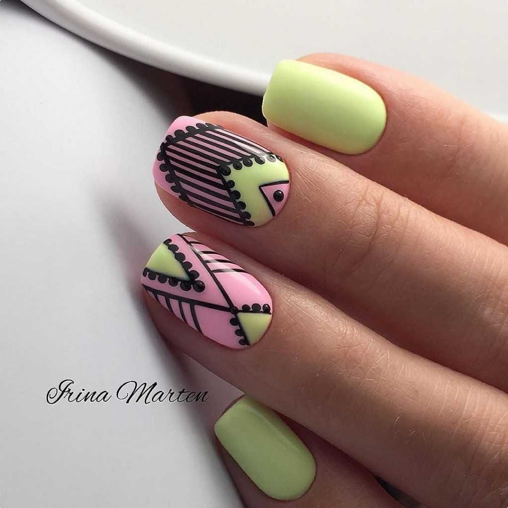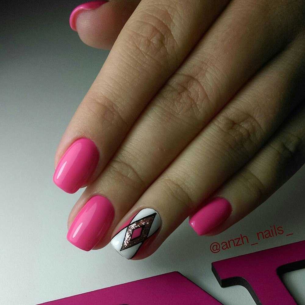 Уже который год подряд остается актуальным геометрический дизайн ноготков. Различные фигуры, треугольники, зигзаги и полосы – все это будет уместным даже в сочетании с розовым цветом.