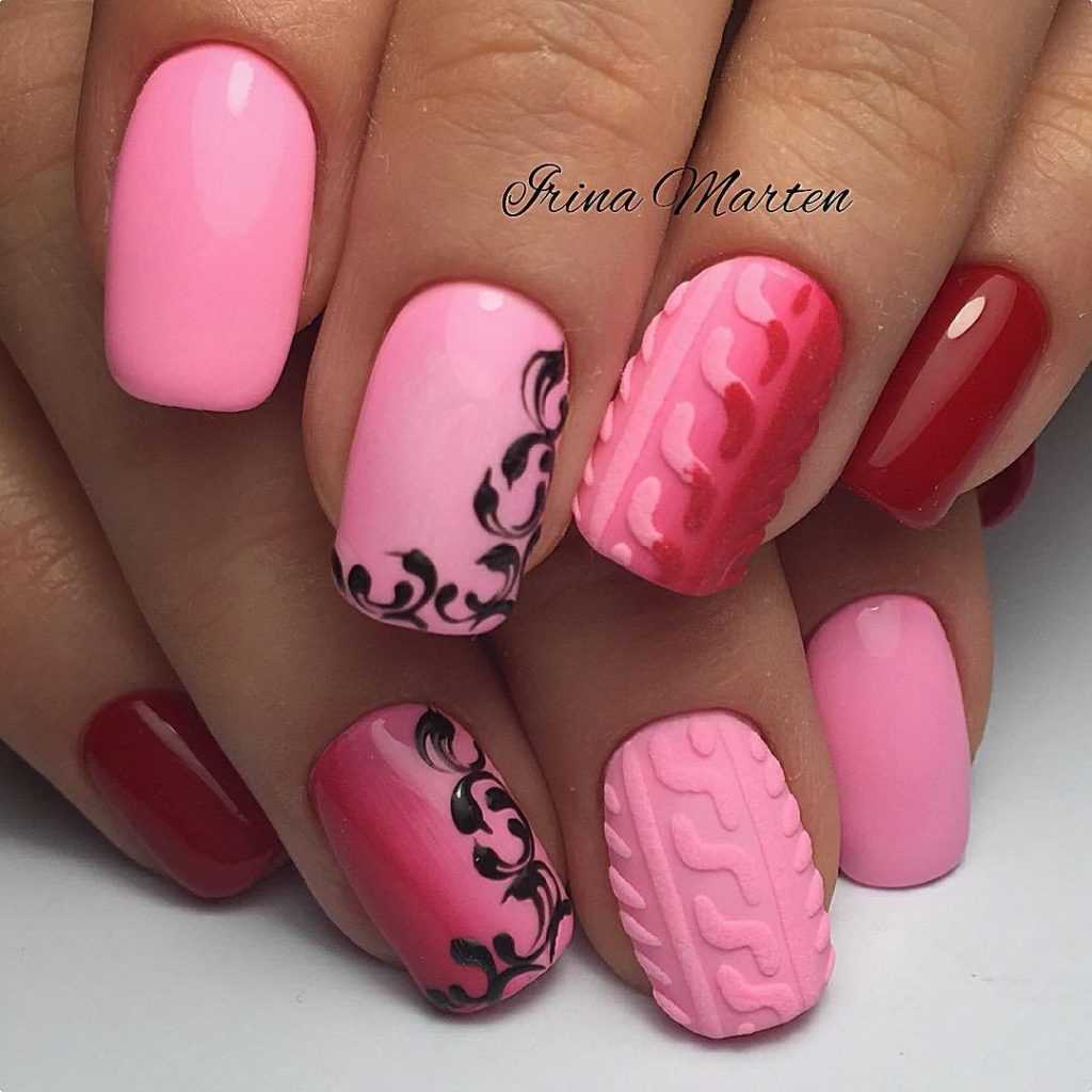 Очень интересные варианты получаются при совмещении “вязаного” объёмного рисунка и различных техник (омбре, френч), цветовых решений (розовый и мятный, ярко-розовый и тёмно-синий), декоративных элементов: