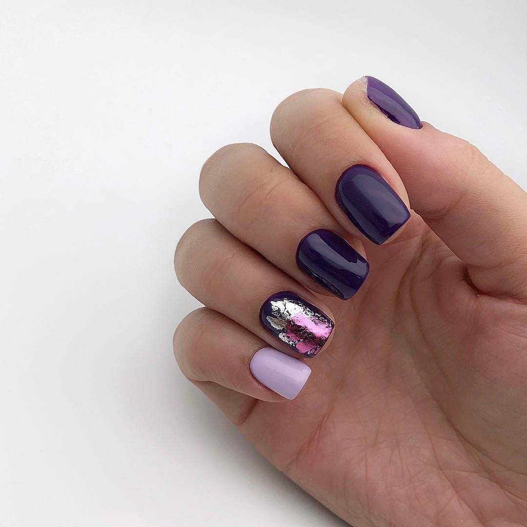 Фольга – популярный декоративный материал. Например, для простого однотонного сиреневого маникюра или френча. Порой реализовываются акценты, предполагающие применение серебристой, золотистой или разноцветной фольги.