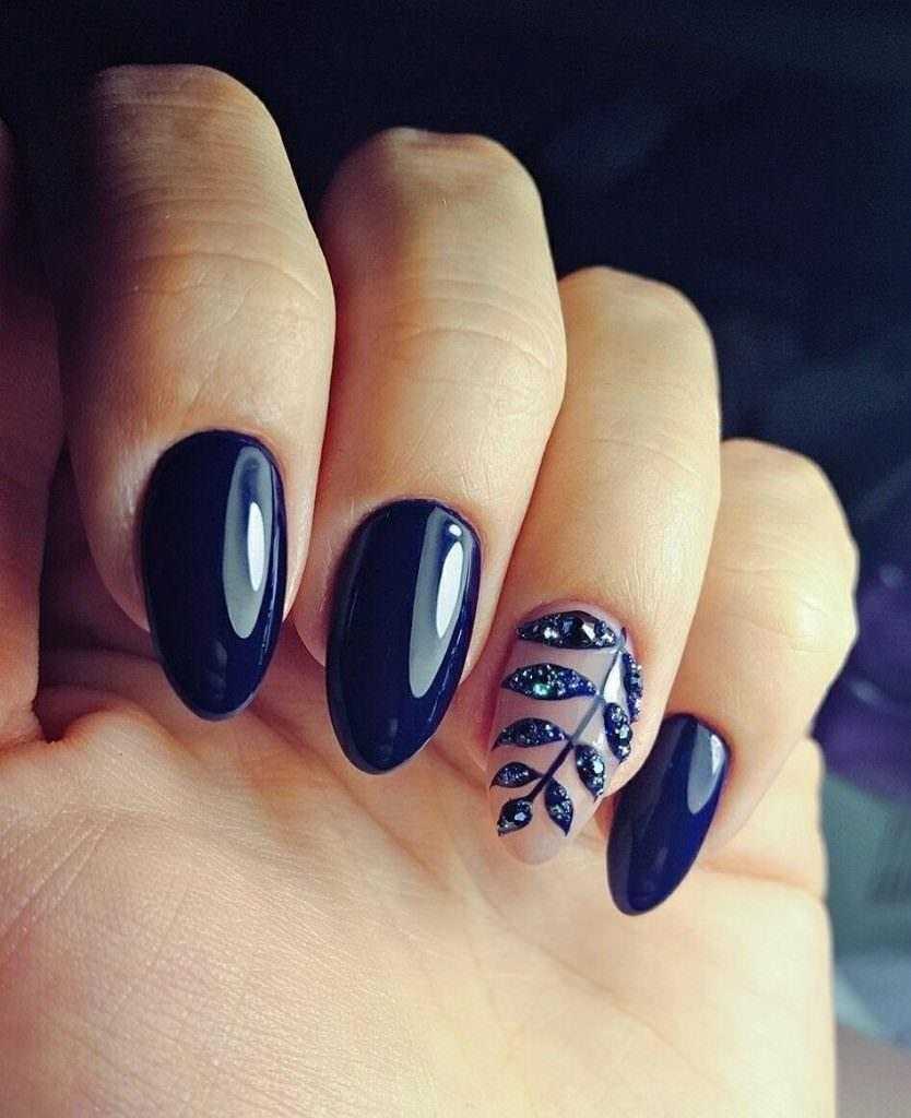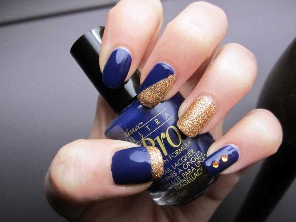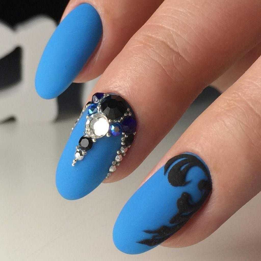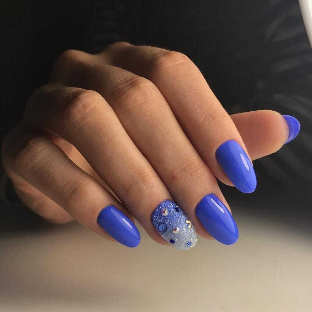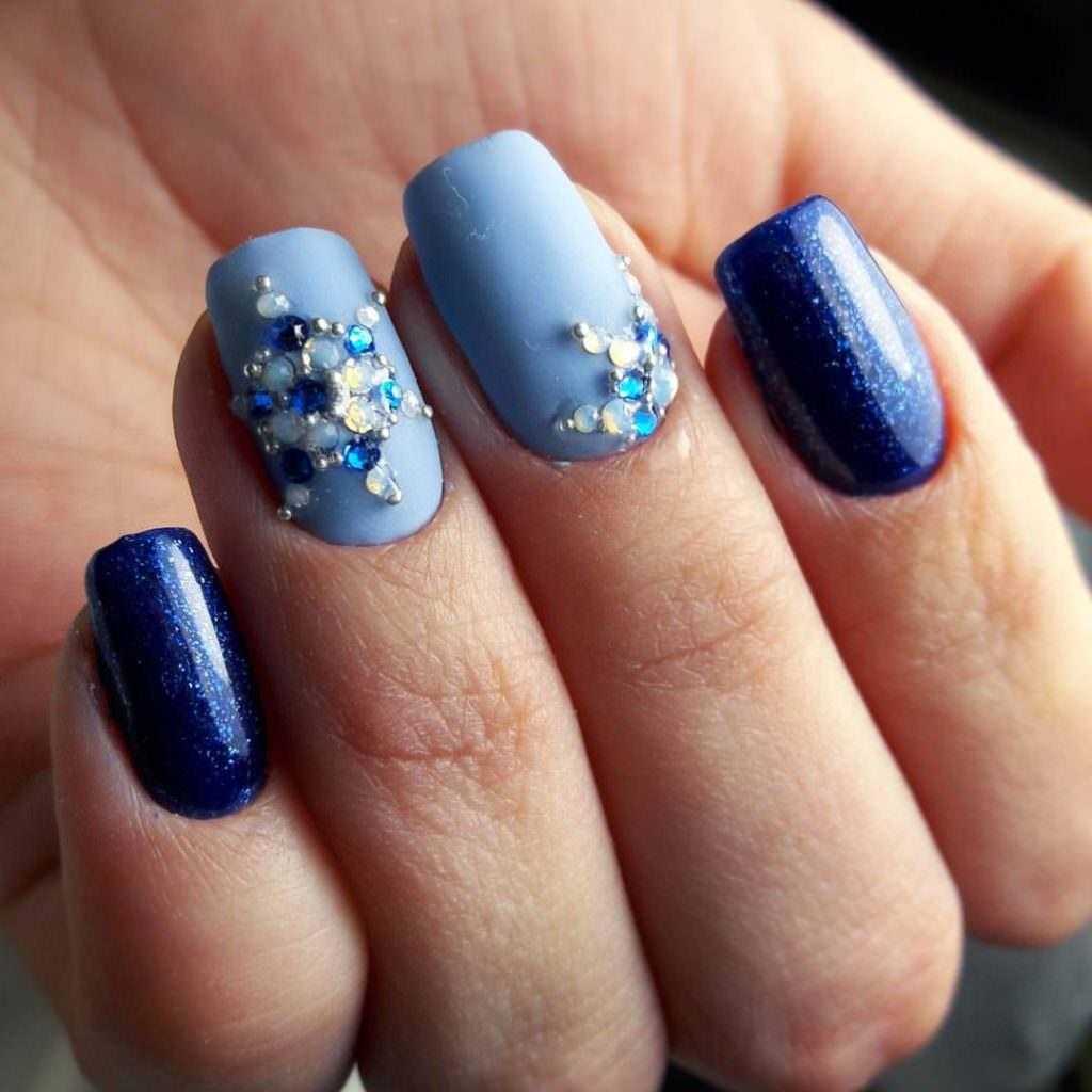 Если на синие ногти добавить инкрустацию стразами получим модный вечерний маникюр. Рекомендуются вариации с различного вида втирками, «модной геометрией».
