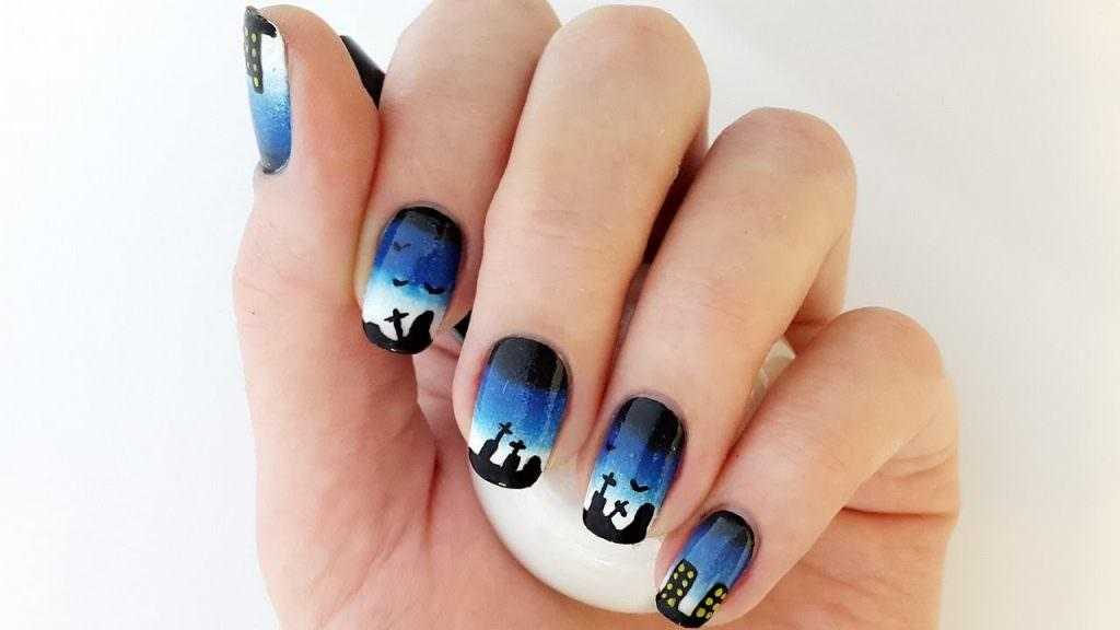 Ночное небо — одна из самых волшебных частей мира. Так почему бы не продемонстрировать его в маникюре? Пусть ваши пальцы коснутся звезд, разбрызгивая их по ногтям. Используйте темно-синий цвет в качестве основы, но покрасьте только половину ногтевого ложа — добавьте несколько золотых точек и полумесяц, чтобы завершить дизайн. Это потрясающий вариант для тех, кто любит высокую моду и наблюдает за созвездиями.