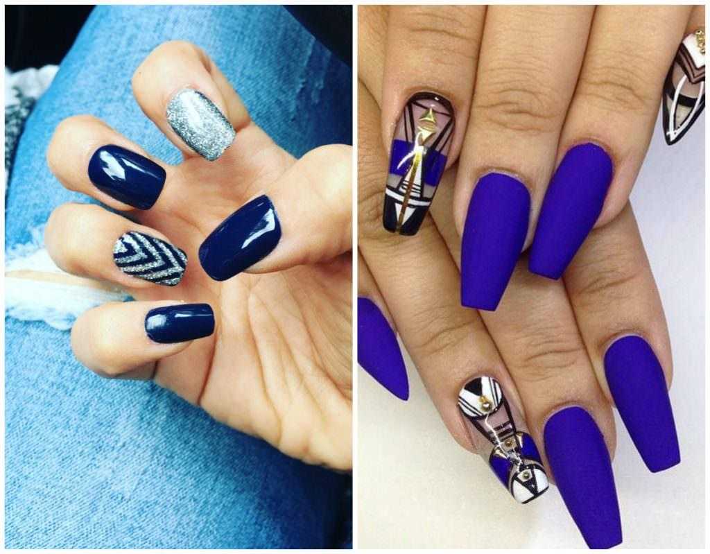 Дизайн геометрических рисунков на синем маникюре сейчас в тренде. Короткие ноготки можно украсить нежными тонкими рисунками, а вот длинные ноготки дают возможность неограниченным фантазиям.