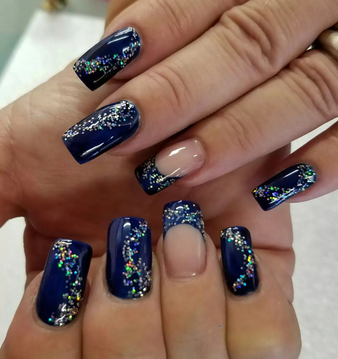 Существует много вариантов разнообразных дизайнов классических лунного и французского маникюров. Оформляя ногти, женщины зачастую используют линии геометрии. Новым трендовым дизайном является слияние френча с лунным в одном маникюре. Синий цвет маникюра, выполненный в классическом стиле можно украсить различными видами декора, выдумать новую технику исполнения.