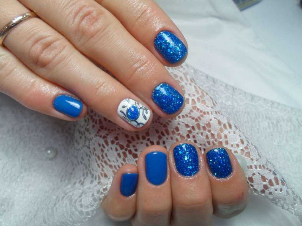 Довольно модный и оригинальный дизайн маникюра выполненного с помощью стиля гжель, прекрасно будет смотреться с синим платьем или летним сарафаном. С помощью гжели лучше оформлять один или два ноготка.