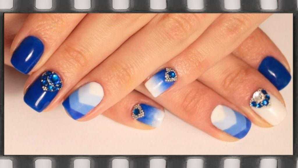 Как ни странно, но для коротких ногтей синий гель-лак тоже подходит. Только не нужно городить на ногтях слишком замысловатые рисунки. Лучше для декора использовать старые добрые стразы и блестки. Тем более что маникюр со стразами выполняется очень быстро и легко и не требует специальных навыков. Хорошо смотрятся короткие ногти с синим матовым маникюром. В дизайне лучше сочетать синий со светлыми оттенками, такими как белый, молочный, песочный, бежевый и т.д. Ноготь будет смотреться более длинным, если сделать полупрозрачный дизайн правильной формы. Линии в рисунке должны быть вертикальными.