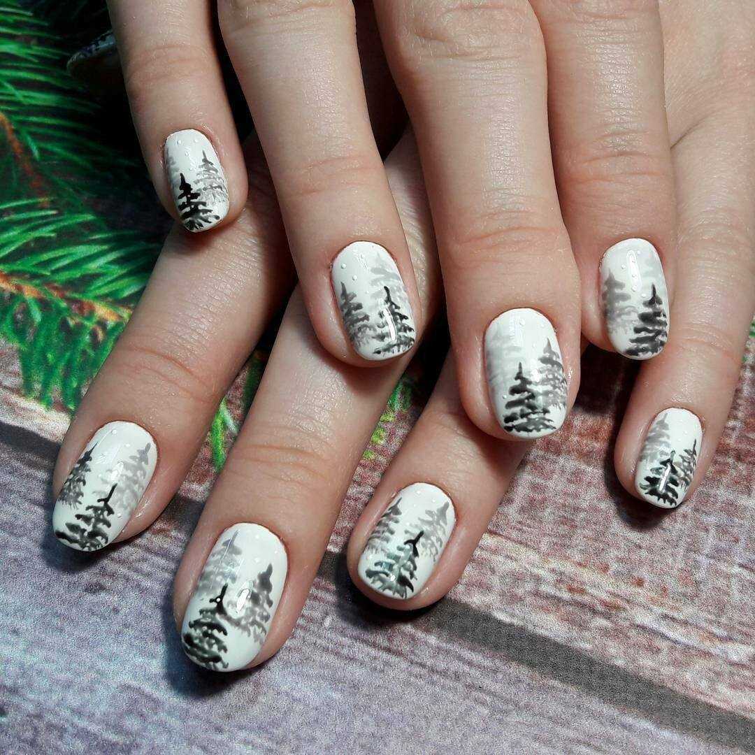 Основу лучше сделать голубой или белой, добавив на нее снежинки. На елке не забудьте разместить соответствующие украшения и звезду, а к ветвям сосны добавить пушистый снег. Хорошо проработанные мелкие элементы делают маникюр качественным!